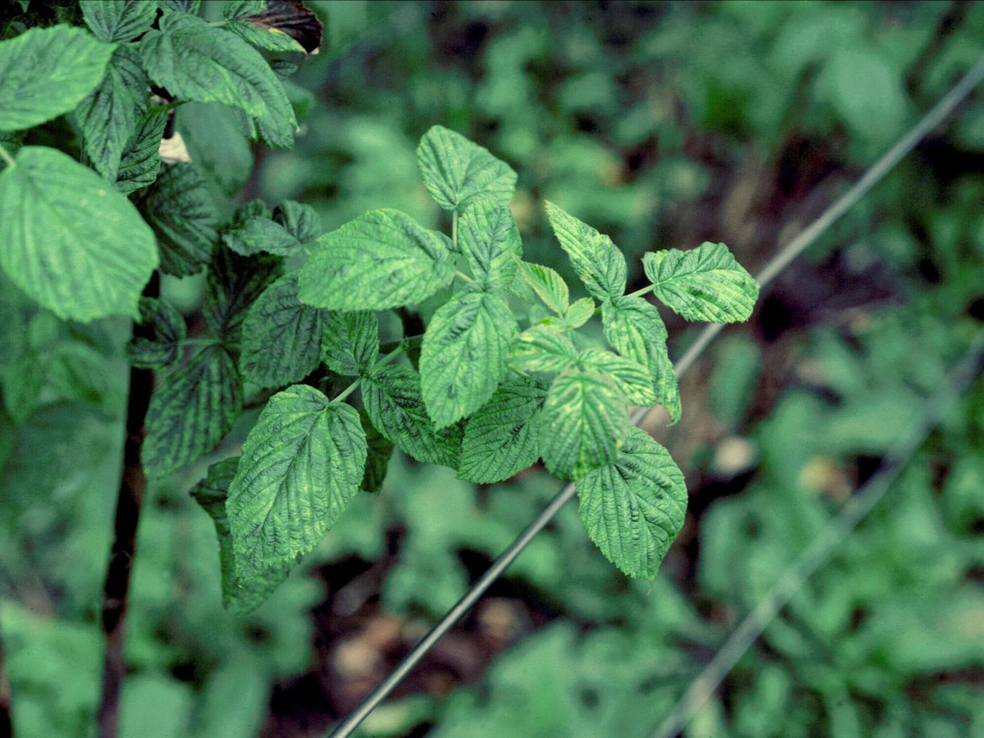 Description: Sur des feuilles de framboisier, présence d’une malformation du limbe et d’une mosaïque vert pâle à jaune. Ces symptômes sont caractéristiques d’une maladie virale dont la nature du virus n’a pu être précisée.