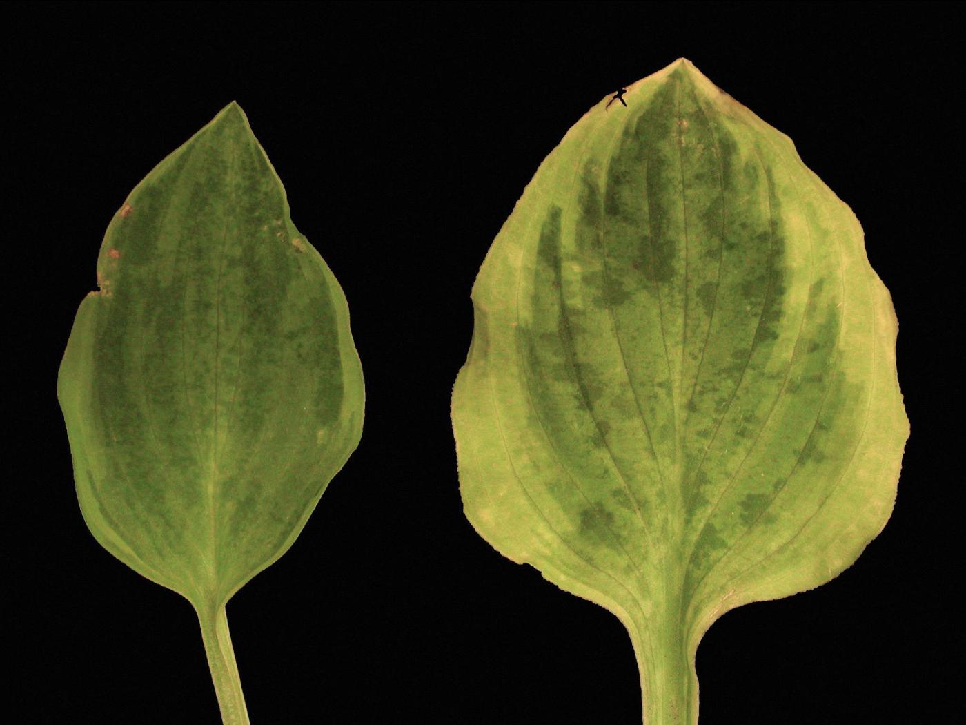 Feuille : le symptôme classique est la présence de taches bleutées ou vertes sur les feuilles claires. Les taches suivent généralement les nervures et diffusent dans les tissus environnants, donnant à la plante une apparence marbrée. D’autres symptômes peuvent être observés comme des mosaïques vert pâle à jaunâtres, du jaunissement le long des nervures, des taches de différentes couleurs, bandes, stries ou points blancs sur feuillage d’un vert uniforme, de brûlures et du gaufrage. Occasionnellement, flétrissement et dépérissement des feuilles.