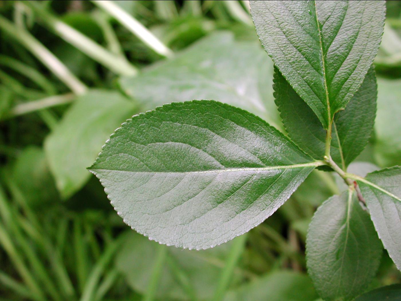 Les feuilles sont elliptiques, abruptement terminées en pointe au sommet et bordées de dents fines et glanduleuses. Elles sont glabres, alternes et simples. La face supérieure du limbe est vert foncé et celle inférieure est vert pâle.