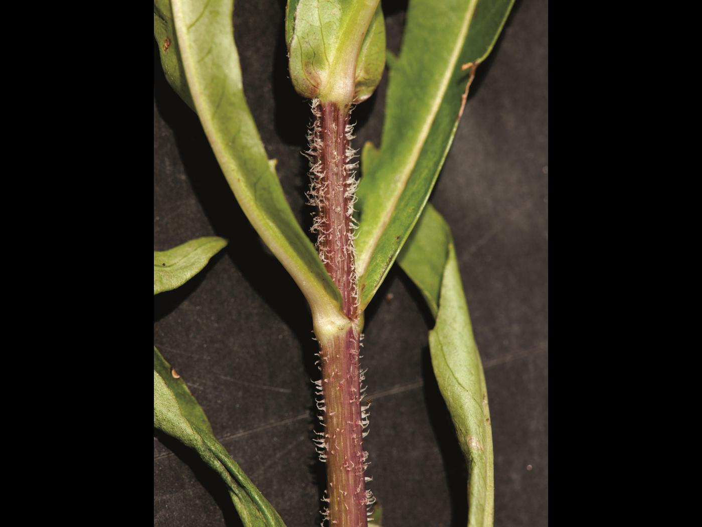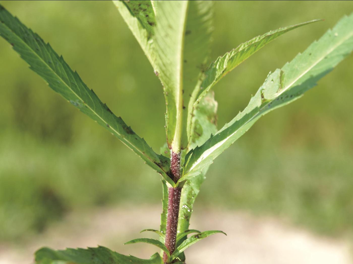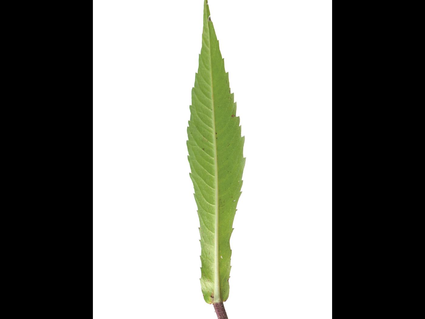 Les feuilles sont opposées, pouvant être soudées par la base autour des nœuds de la tige. Le limbe est de forme lancéolée à linéaire, il mesure de 4 à 10 cm de longueur et de 0,5 à 2,5 cm de largeur. La marge est de plus en plus dentée vers le haut de la plante. La nervure centrale est proéminente.