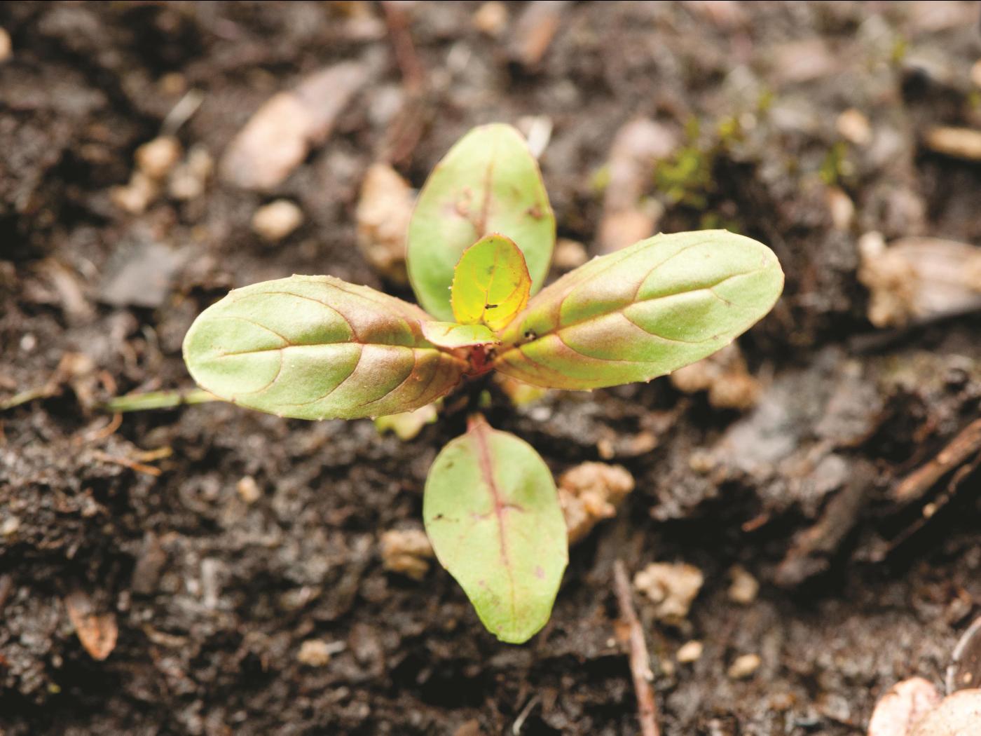 La plantule est à tige et à feuilles opposées. Les premières feuilles sont minces et partiellement colorées.