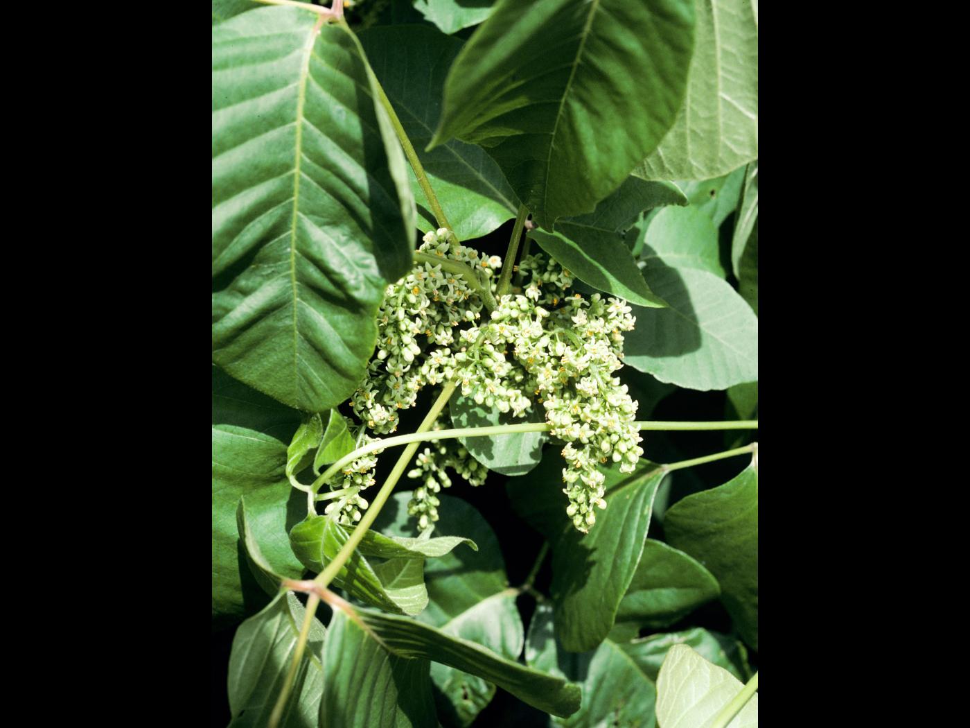 Les fleurs sont rassemblées en grappes à l’aisselle des feuilles. Elles sont petites et vert jaunâtre. Les fleurs mâles et femelles sont généralement sur des plants distincts.