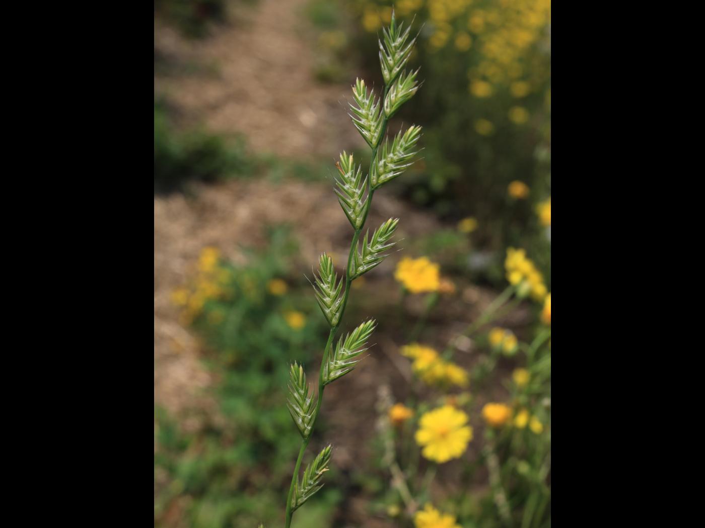 L’inflorescence est un épi d’aspect aplati mesurant de 10 à 25 cm de longueur. Les épillets sont opposés par leur dos à l’axe central et sont disposés en alternance sur l’axe. Ils se composent de 10 à 20 fleurons et mesurent de 15 à 25 mm de longueur. Une glume sous-tend chaque épillet et mesure de 5 à 10 mm de longueur, c’est-à-dire moins de la moitié de la longueur de l’épillet. Chaque lemme porte une arête bien visible mesurant jusqu’à 15 mm de longueur.