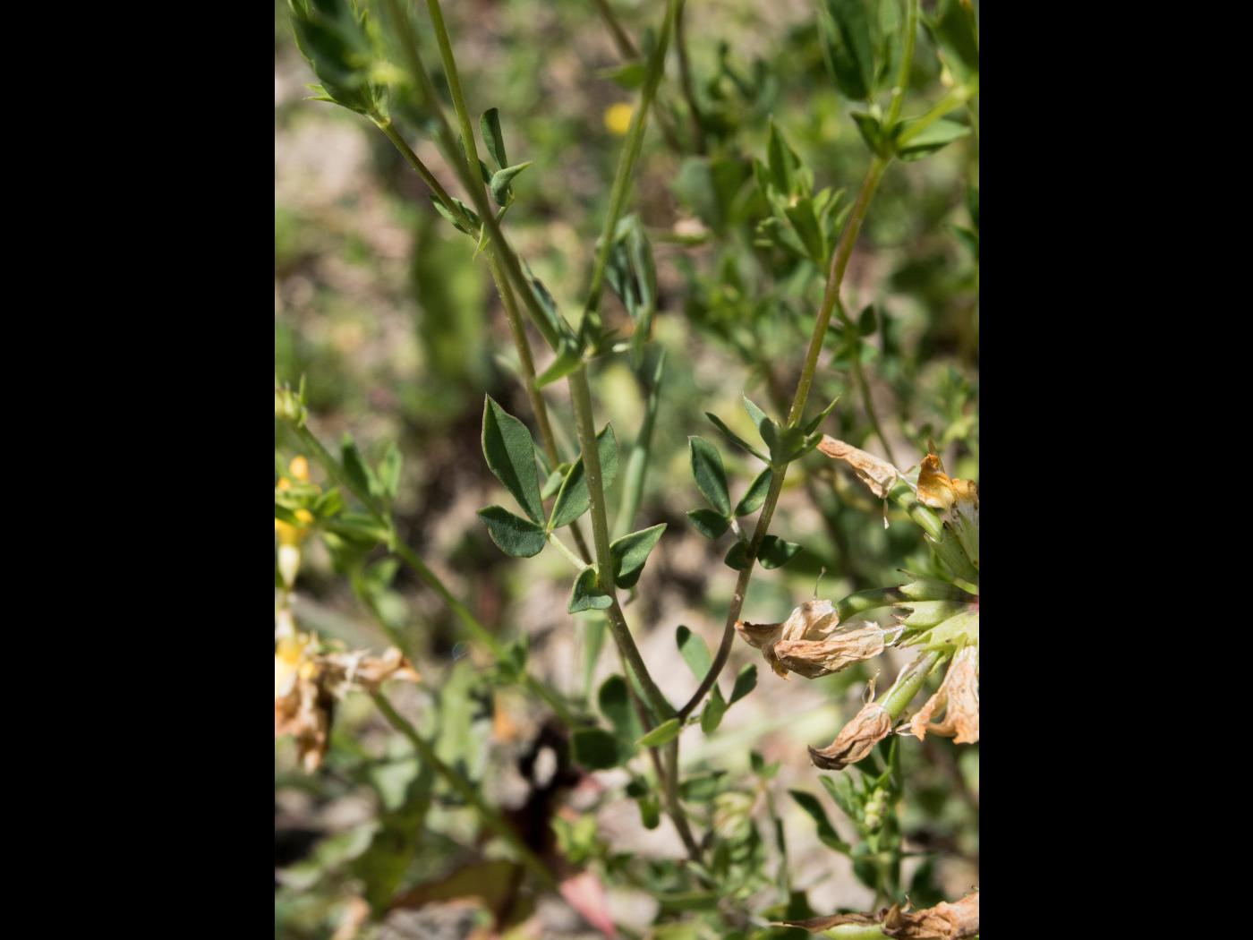 Les feuilles sont trifoliolées et alternes sur la tige. À leur base, les feuilles sont accompagnées de 2 stipules. Ces dernières sont presque sessiles sur la tige et ressemblent aux folioles. Les folioles sont de forme elliptique à oblancéolée et mesurent de 5 à 15 mm de longueur et de 2 à 9 mm de largeur. Leur marge est entière.