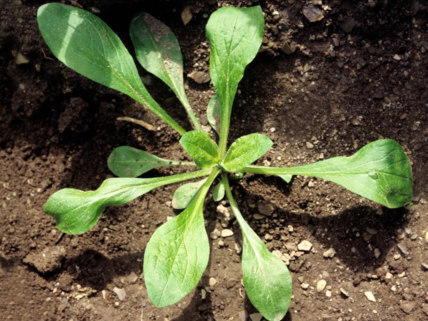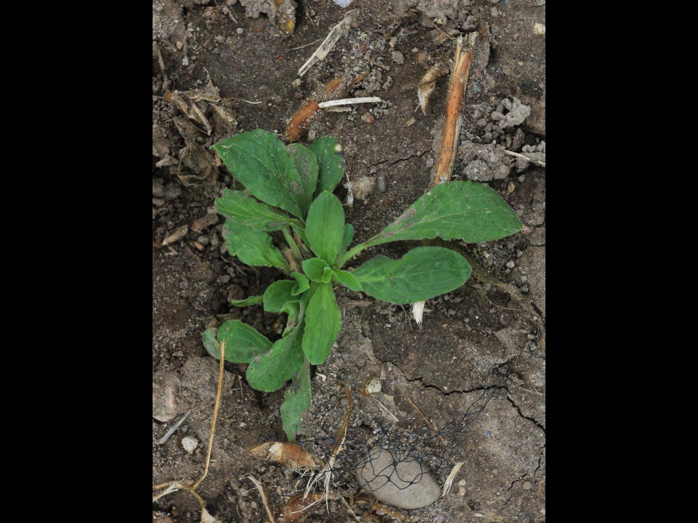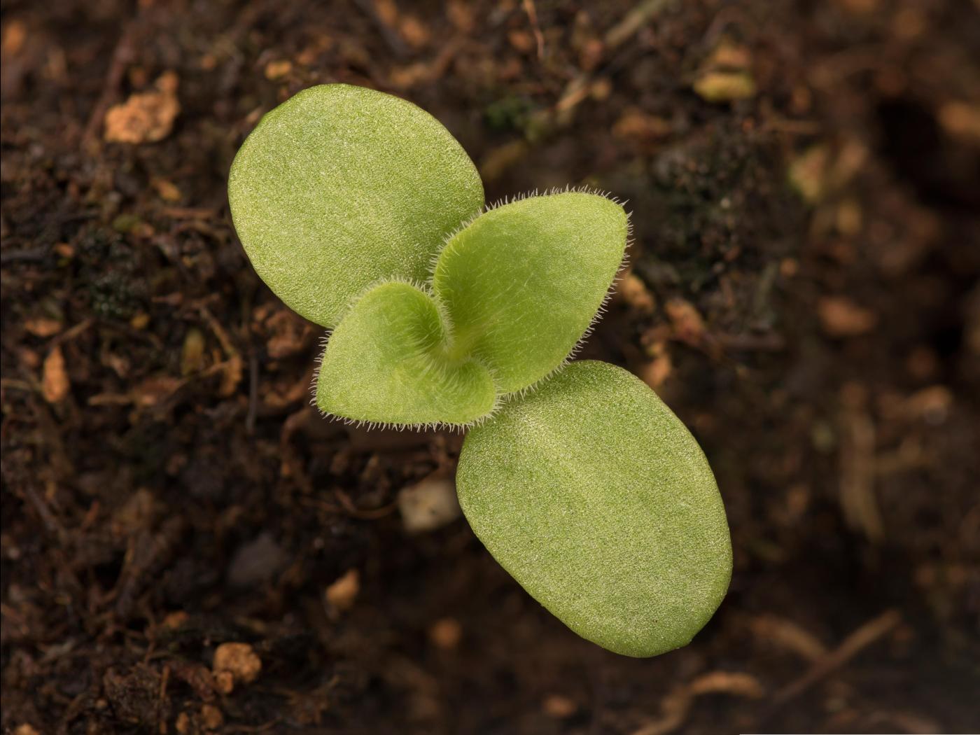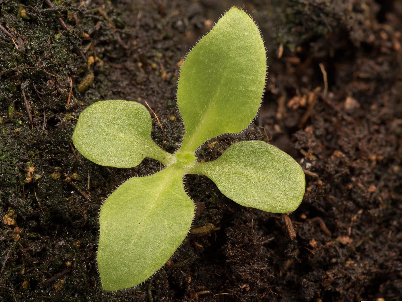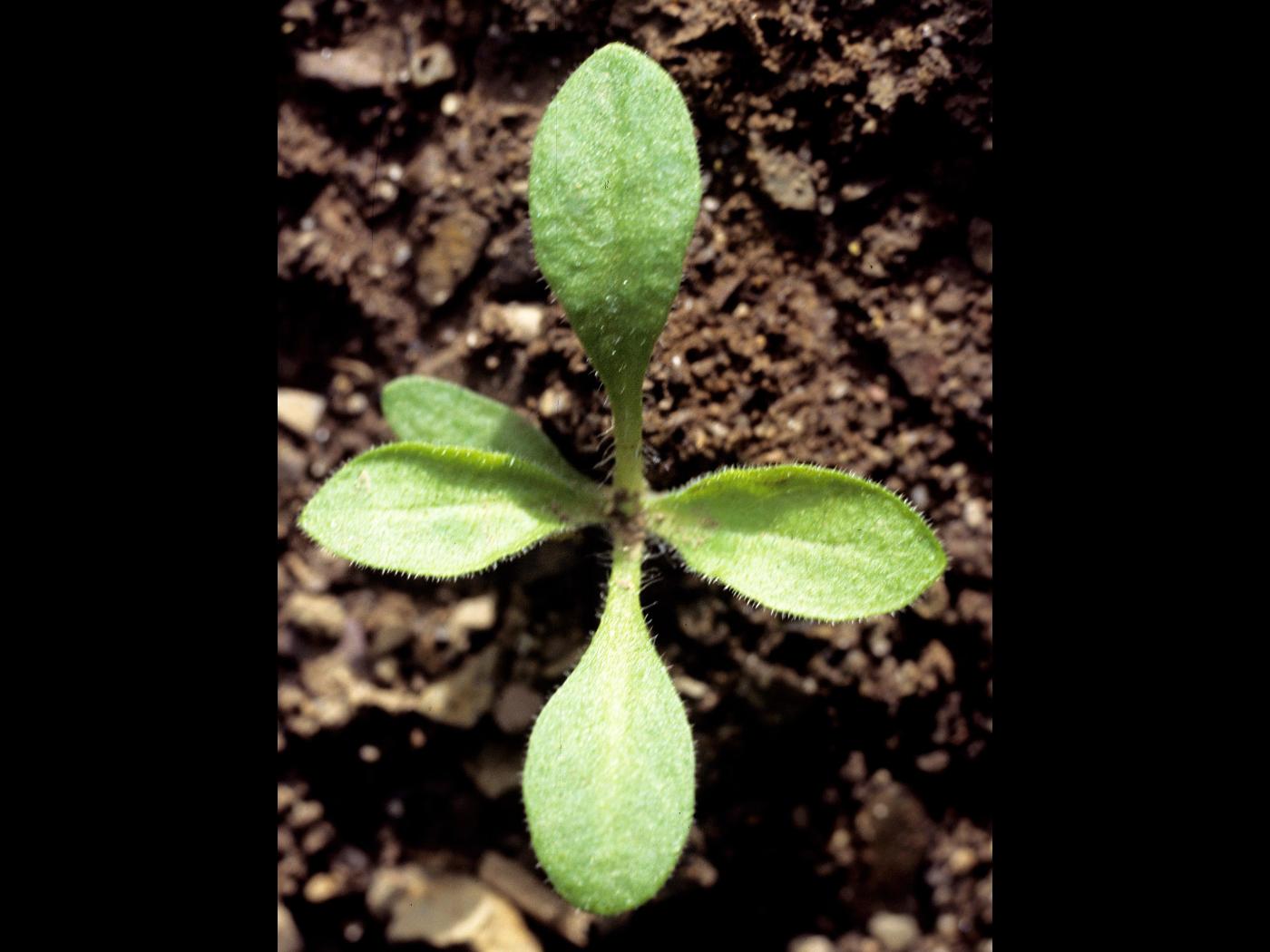 La plantule est à rosette et à feuilles opposées. Les cotylédons sont de forme oblongue à allongée, ils sont charnus et glabres. Ils mesurent de 10 à 15 mm de longueur. Les premières feuilles sont à marge entière, de forme arrondie à ovale et terminées par une petite pointe. Elles sont pubescentes et présentent de longs poils sur le bord du limbe.