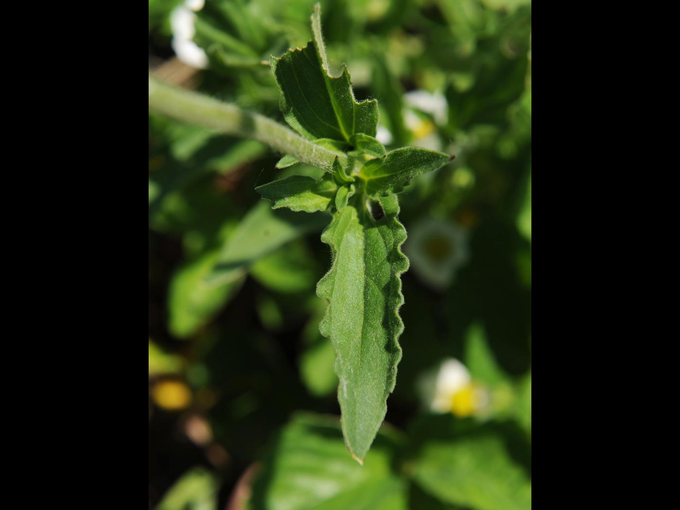 Les feuilles de la base sont à marge entière, de forme allongée et plus larges au sommet (spatulées). Elles mesurent de 3 à 10 cm de longueur et de 1 à 4 cm de largeur. Les nervures sont bien apparentes et de longs poils sont présents sur le bord du limbe. Celui-ci s’atténue en un long pétiole. Les feuilles caulinaires sont de forme ovée à elliptique avec un apex acuminé. Leur taille diminue vers le haut du plant. Elles sont opposées et s’attachent directement à la tige par leur base élargie.
