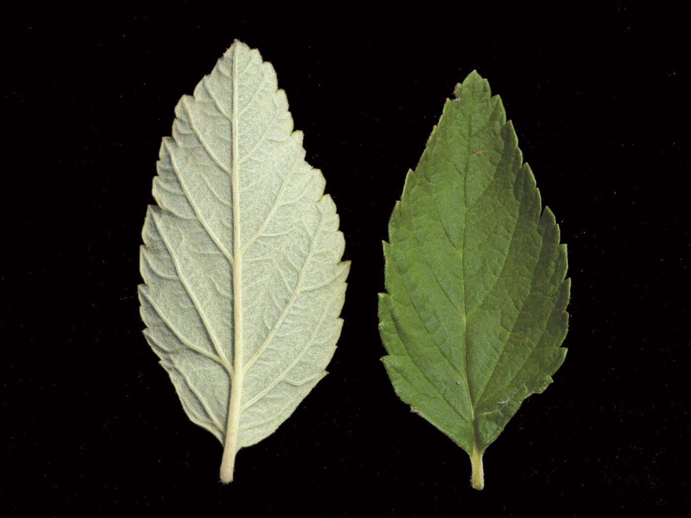 Les feuilles sont alternes et portées par un pétiole mesurant moins de 3 mm de longueur. Elles sont de forme elliptique, rétrécissant graduellement à la base et à marge dentée. La face inférieure est vert pâle et tomenteuse tandis que la face supérieure est vert foncé et glabre. Elles présentent des nervures pennées proéminentes.