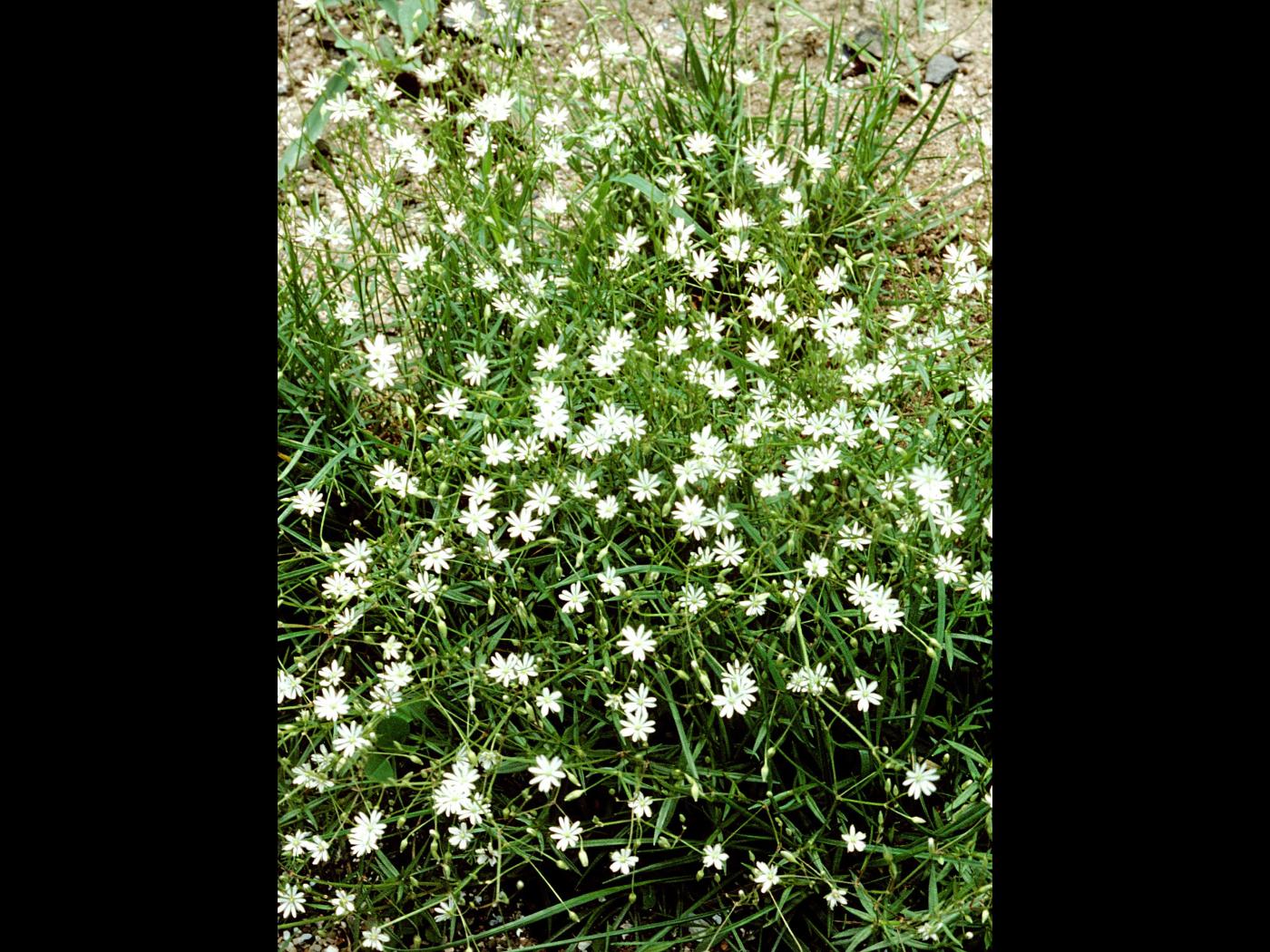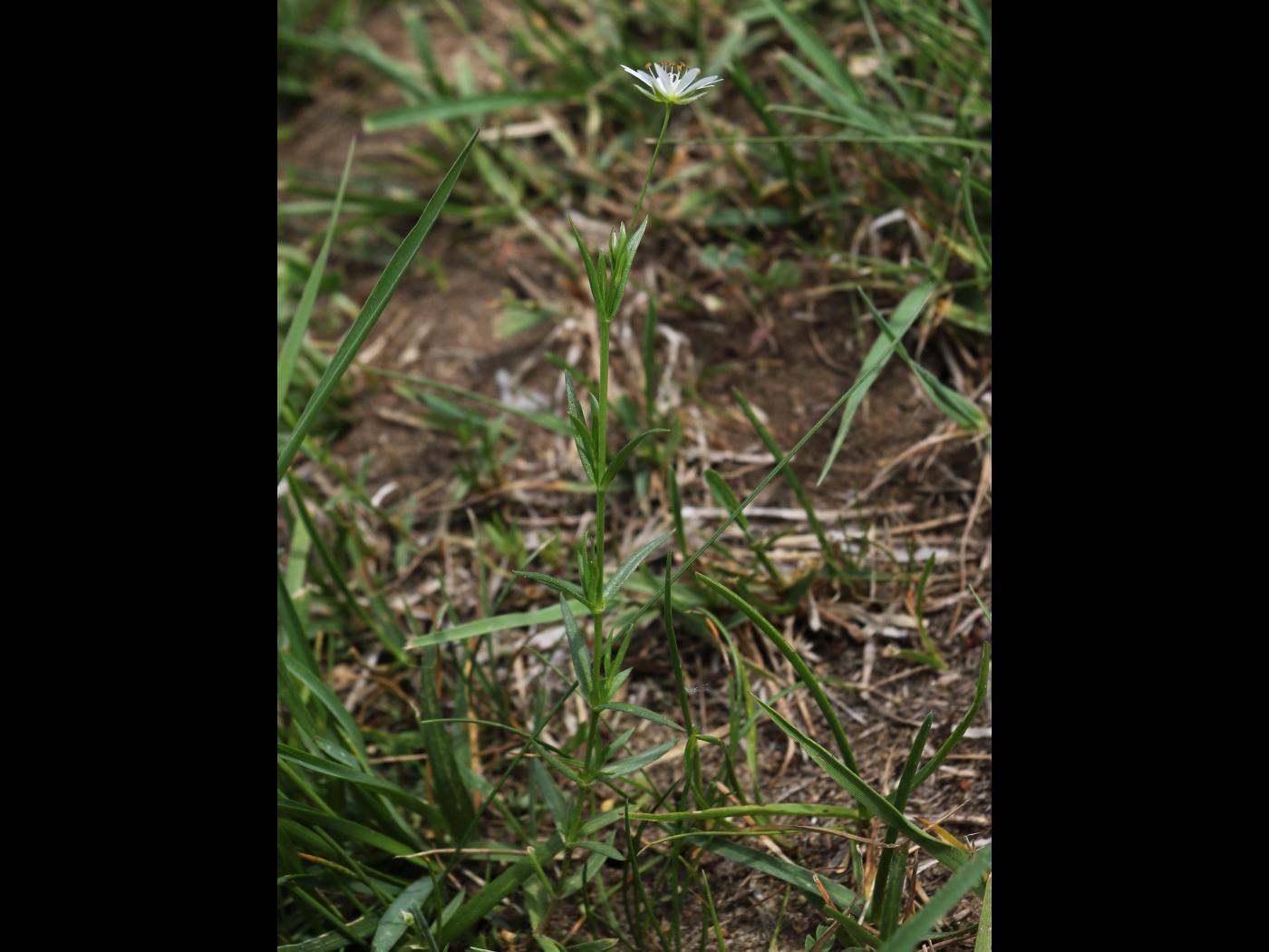 La stellaire à feuilles de graminée est une espèce vivace, originaire d’Europe. Toute la plante est glabre. La tige a un port couché et mesure de 20 à 50 cm de longueur. Elle est carrée, très ramifiée et a la capacité de s’enraciner aux nœuds pour donner de nouvelles pousses. Si la tige est pincée, on découvre un axe très élastique à l’intérieur. Le système racinaire se compose de racines fibreuses peu profondes avec des rhizomes.