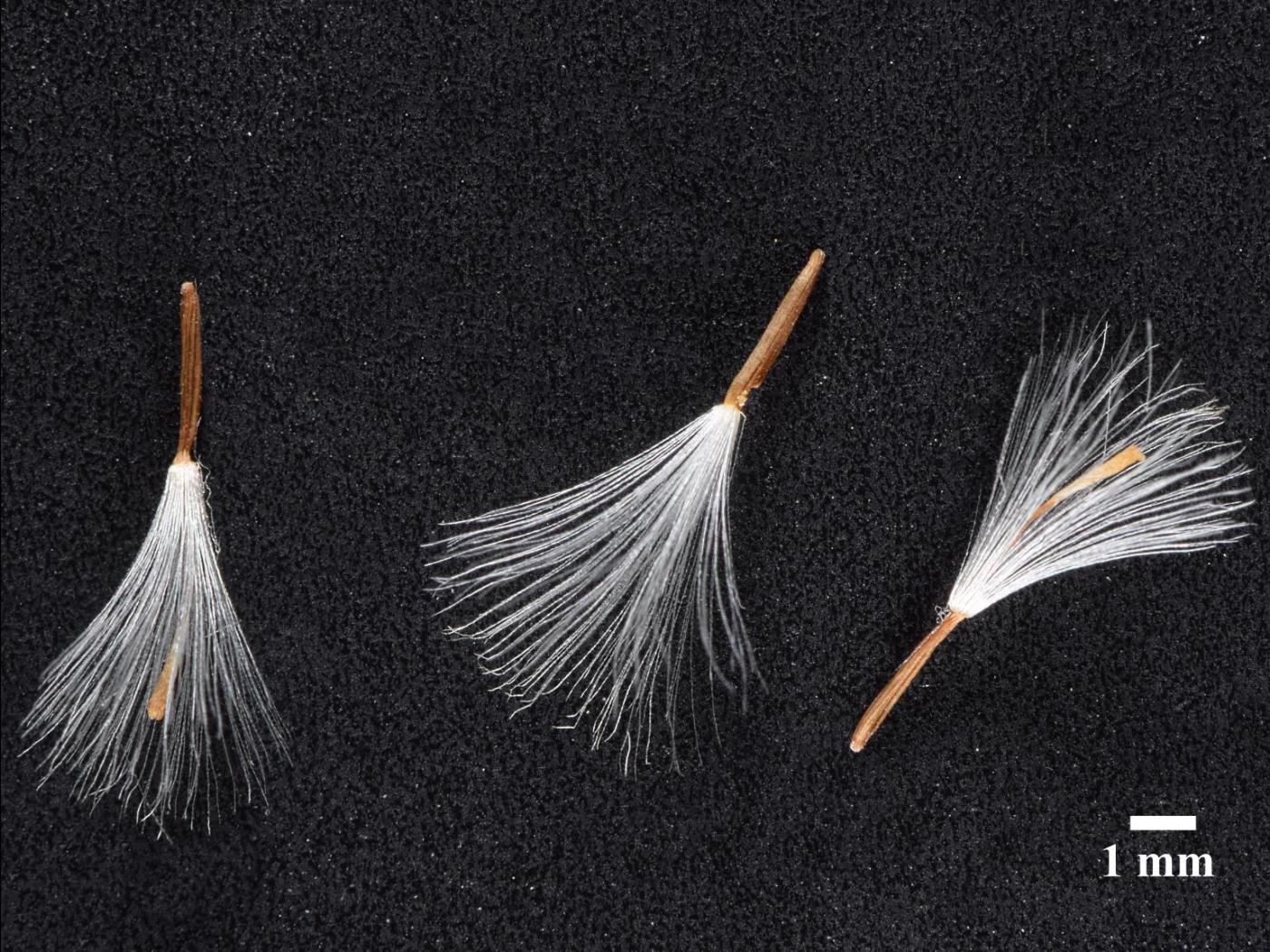 Le fruit est une cypsèle noire, de forme oblongue et légèrement ondulée. La cypsèle porte un pappus de couleur blanche à son extrémité.