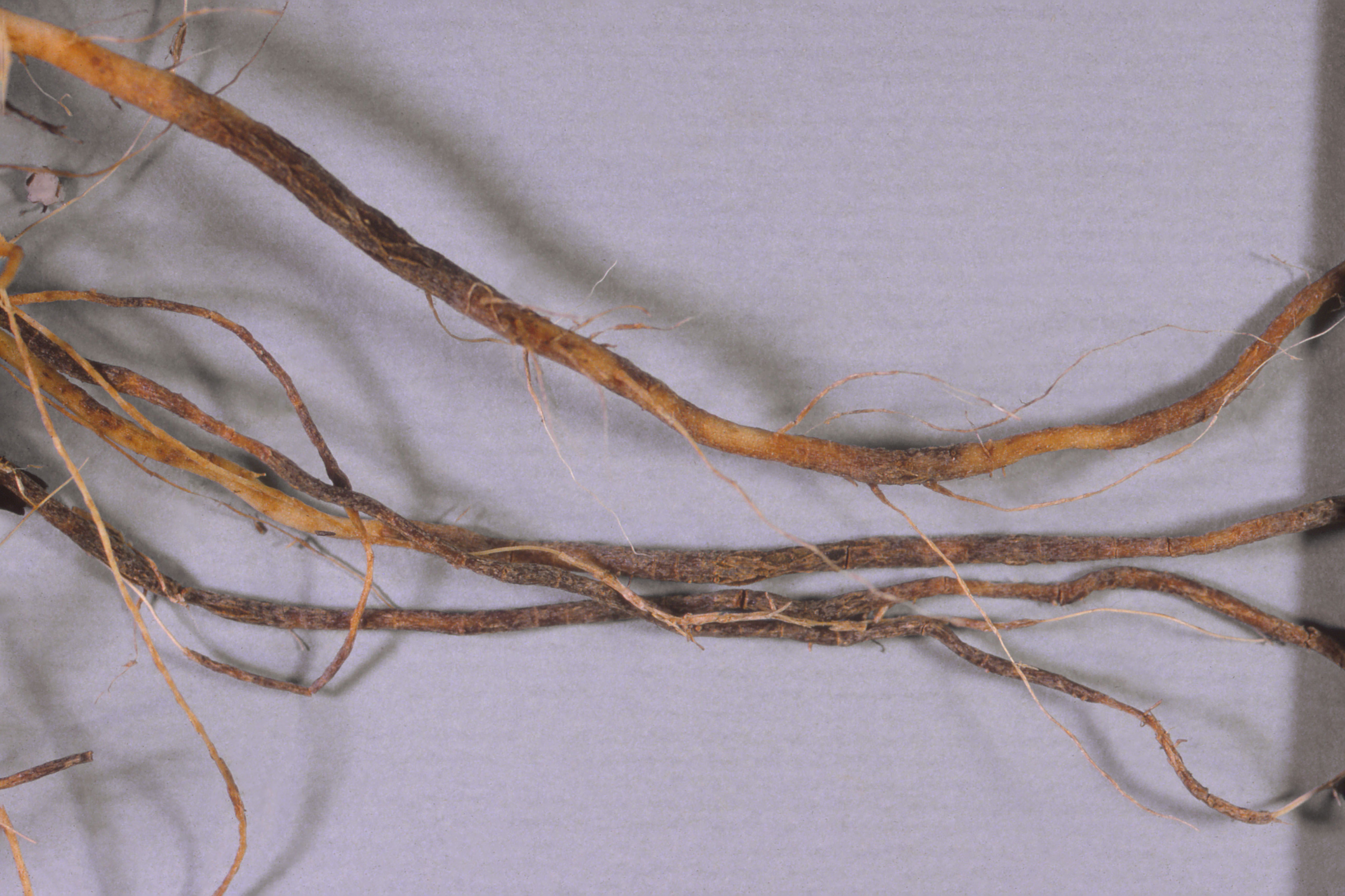 Le système racinaire d’un plant de tomate de serre (cv 'Caruso') montre des racines renflées, brunes et liégeuses. Les observations microscopiques ont révélé la présence du champignon Pyrenochaeta lycopersici, responsable de la racine liégeuse chez la tomate.