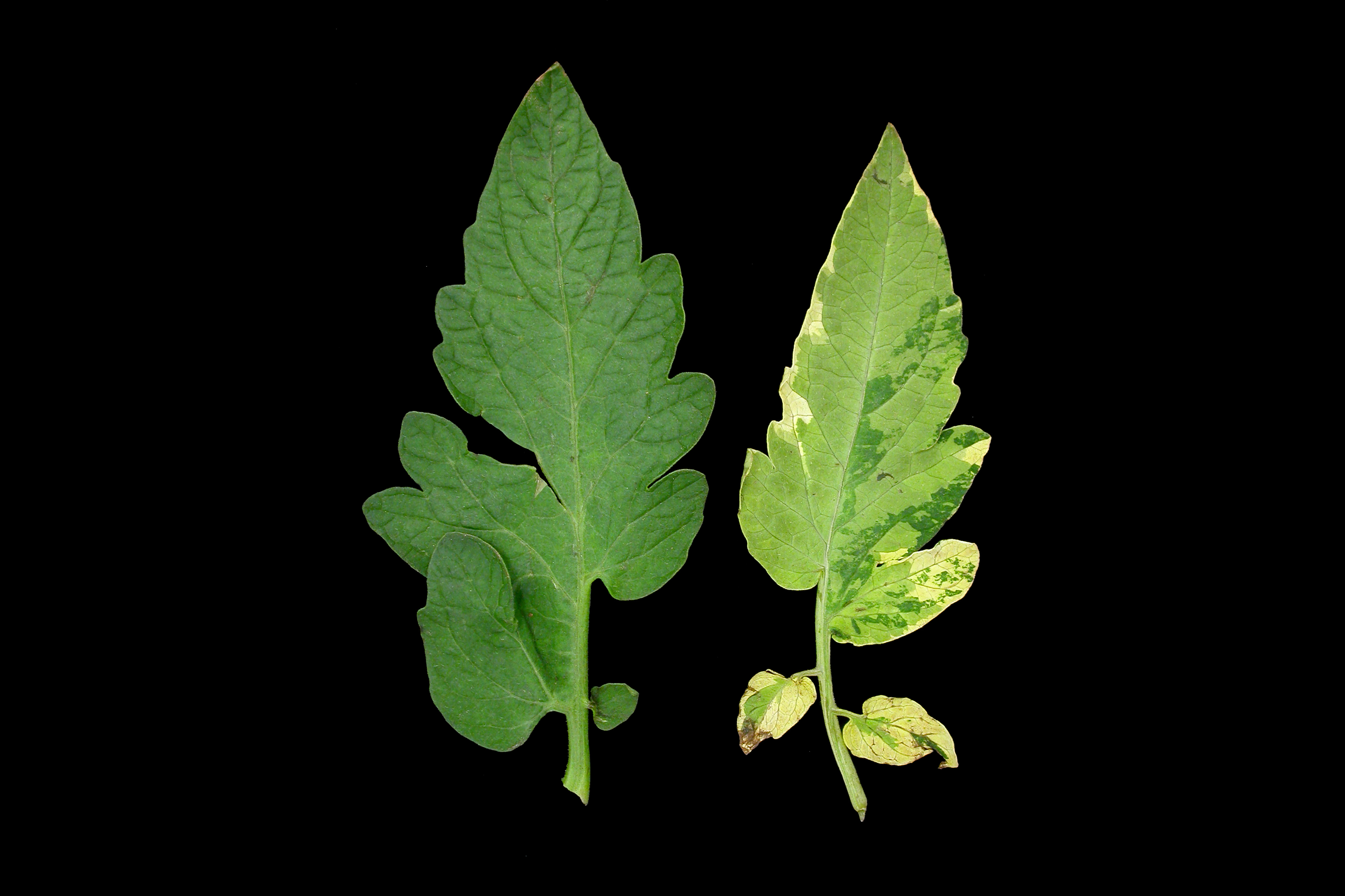Comparaison entre une foliole de tomate de serre (cv 'Westland') saine et affectée. La foliole affectée montre des plages jaunâtres, dont la marge est bien délimitée des tissus sains. Les symptômes sont observés principalement sur un seul côté du limbe. Aucun virus n’a été détecté des dommages. Ce symptôme est caractéristique d’un désordre génétique appelé argenture.