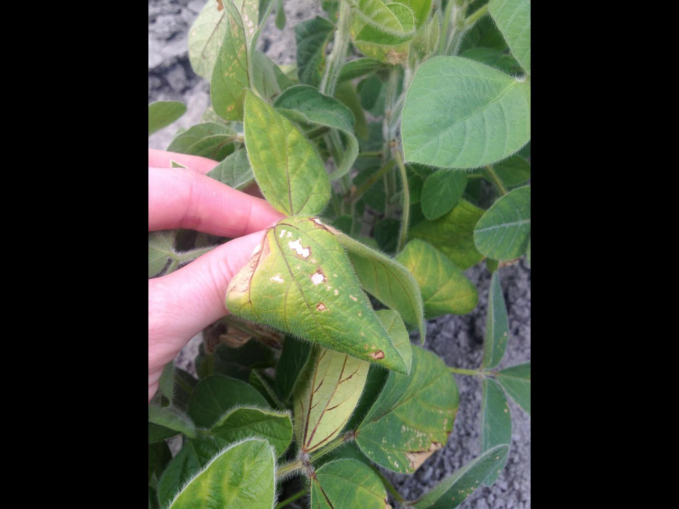 Feuille : anomalie de coloration (jaunissement à blanchiment entre les nervures ou jaunissement à la marge des vieilles feuilles puis dessèchement, brunissement et brûlure des tissus). Toute la feuille peut devenir jaune sauf les nervures qui demeurent vertes. Les vieilles feuilles sont plus affectées que les nouvelles. Les herbicides contenant de l’atrazine peuvent affecter tous les niveaux de feuilles.