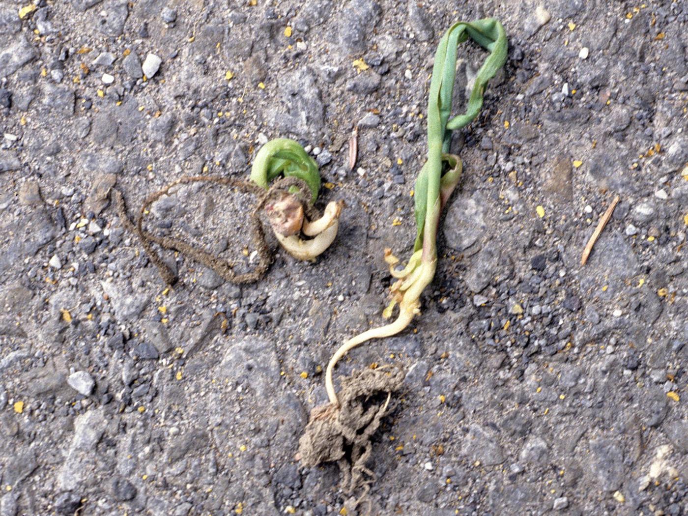 Description: Les plantules de maïs grain et fourrager sont déformées et leur croissance est inhibée. Les feuilles sont enroulées sur elles-mêmes et le système racinaire est peu développé et parfois pourri (peu visible ici). Le semis trop superficiel a exposé les semences à l’herbicide dicamba.