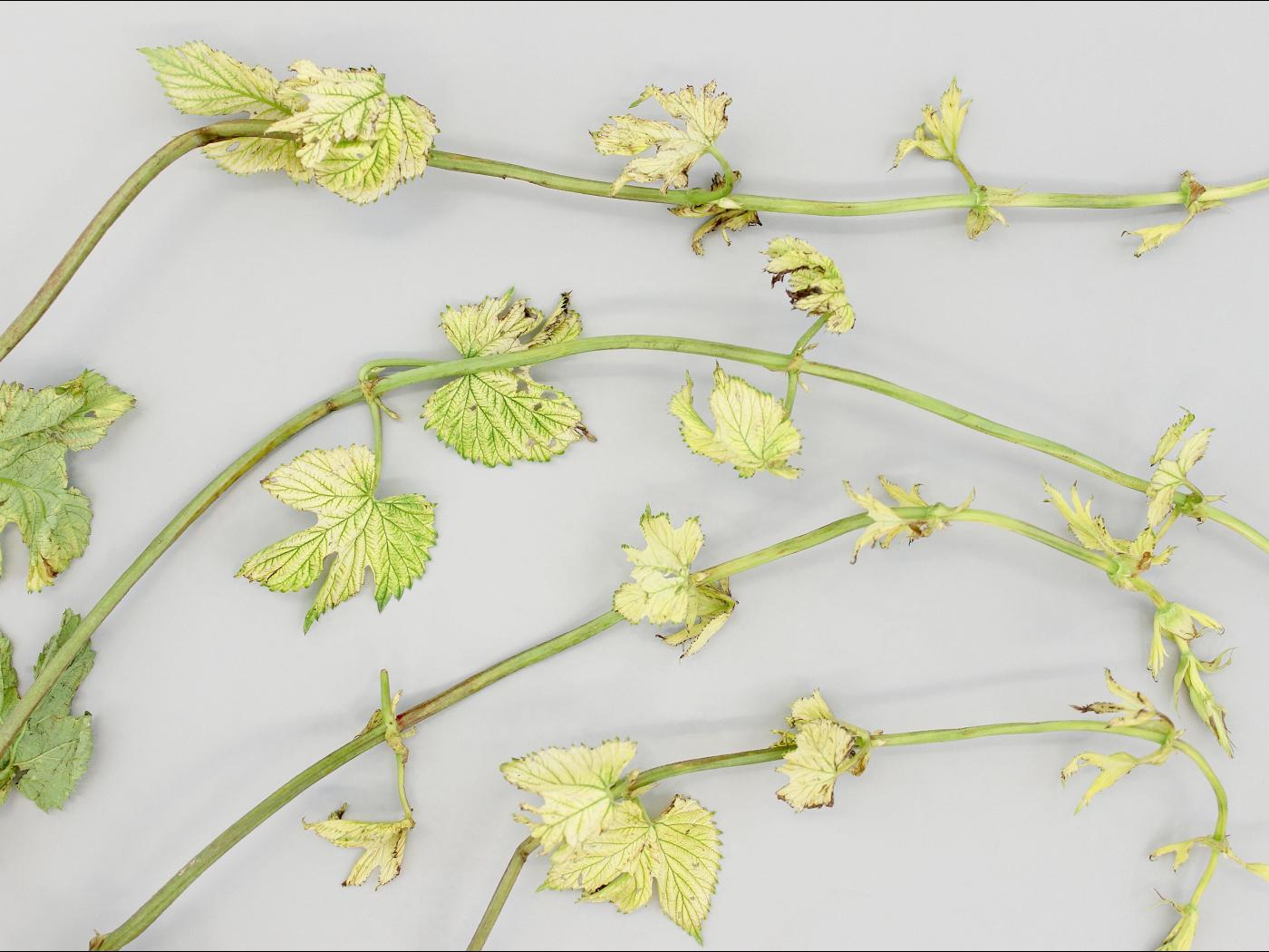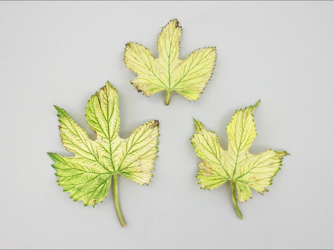 Feuille : présence d’un jaunissement à blanchiment du limbe entre les nervures et de malformations (limbe réduit, feuille effilée ou petite, gaufrage du limbe, feuilles regroupées serrées en rosette). Les nervures demeurent vertes. Des nécroses peuvent être observées.