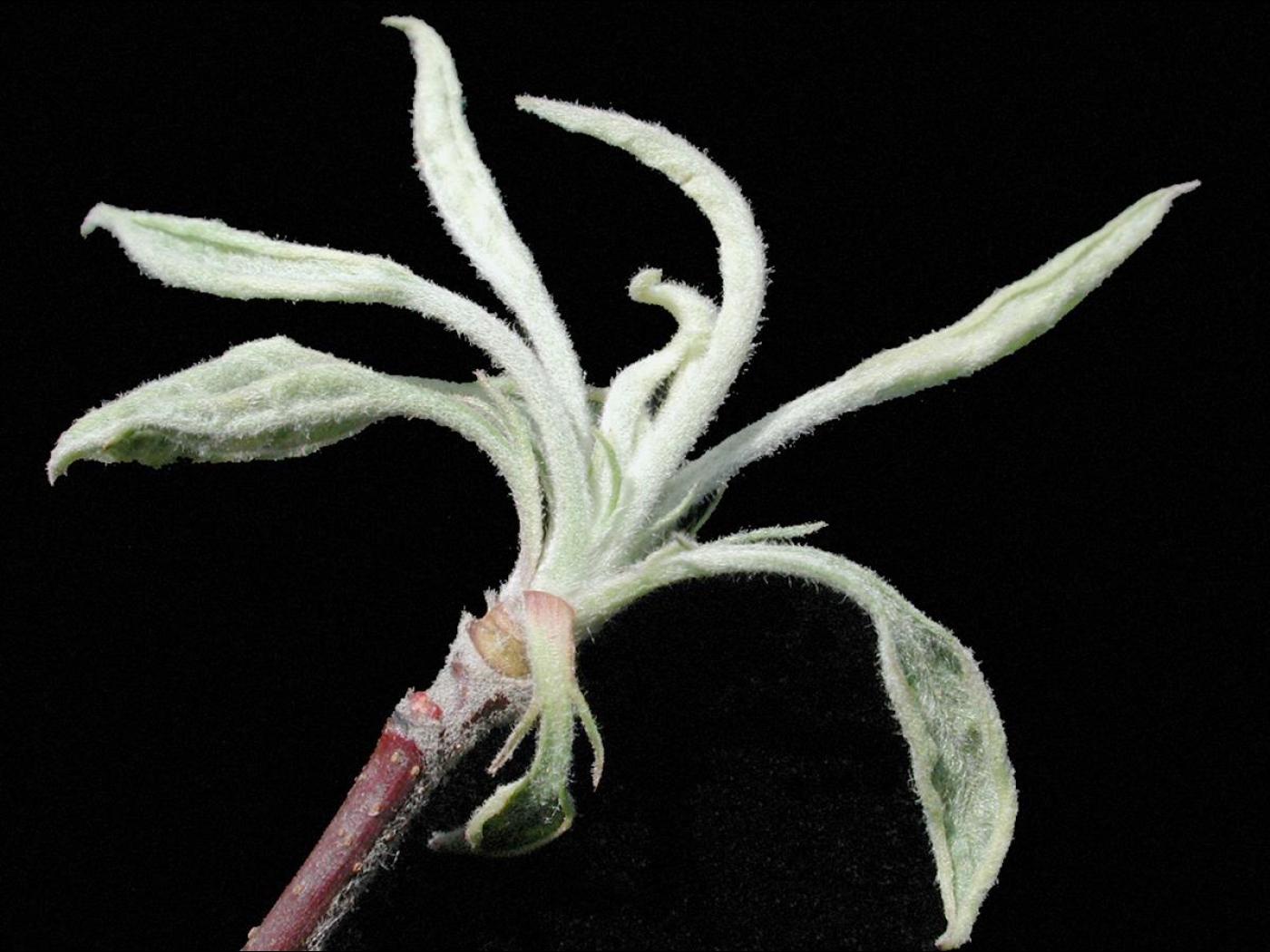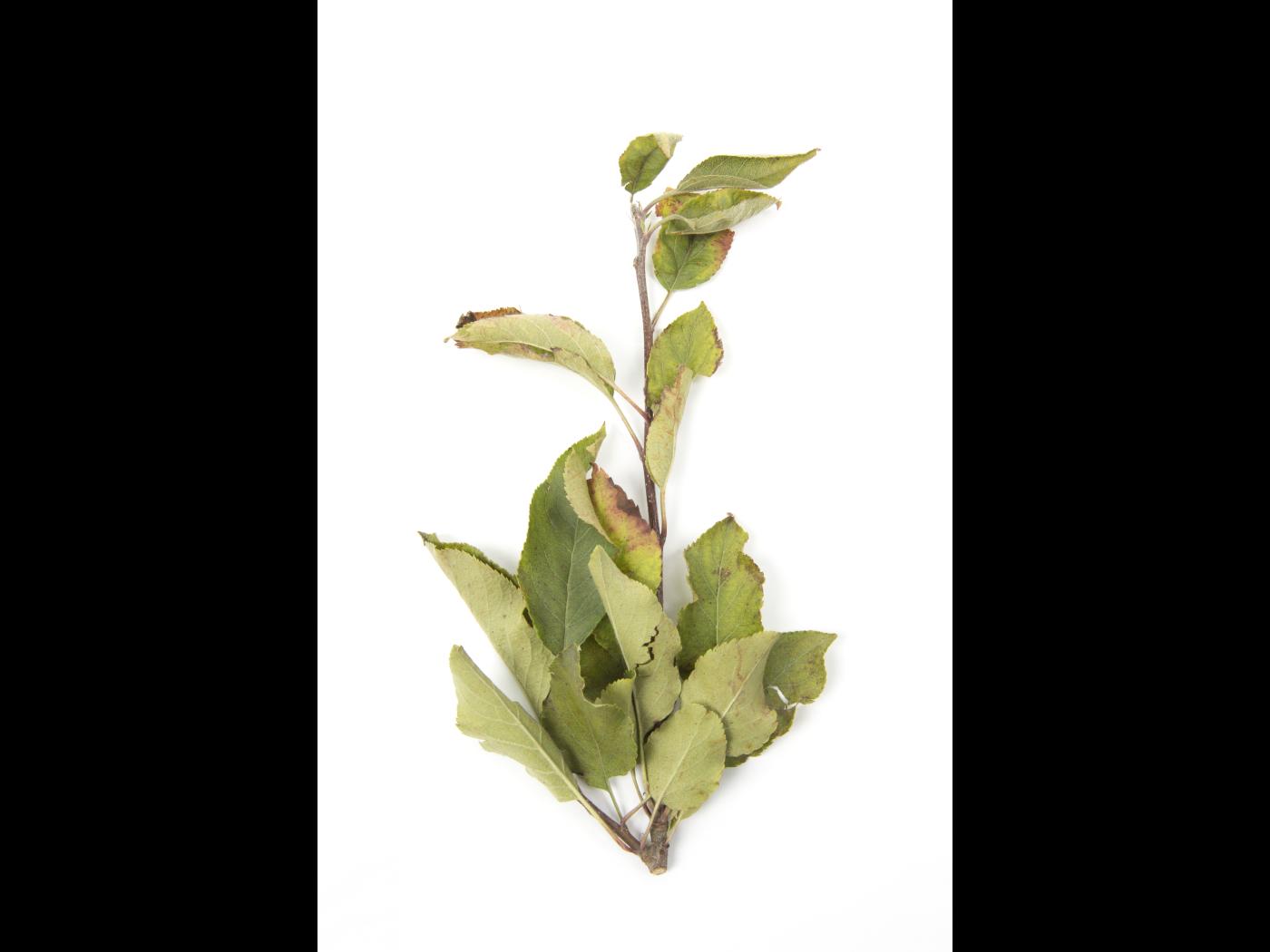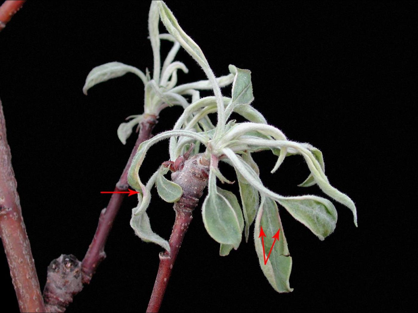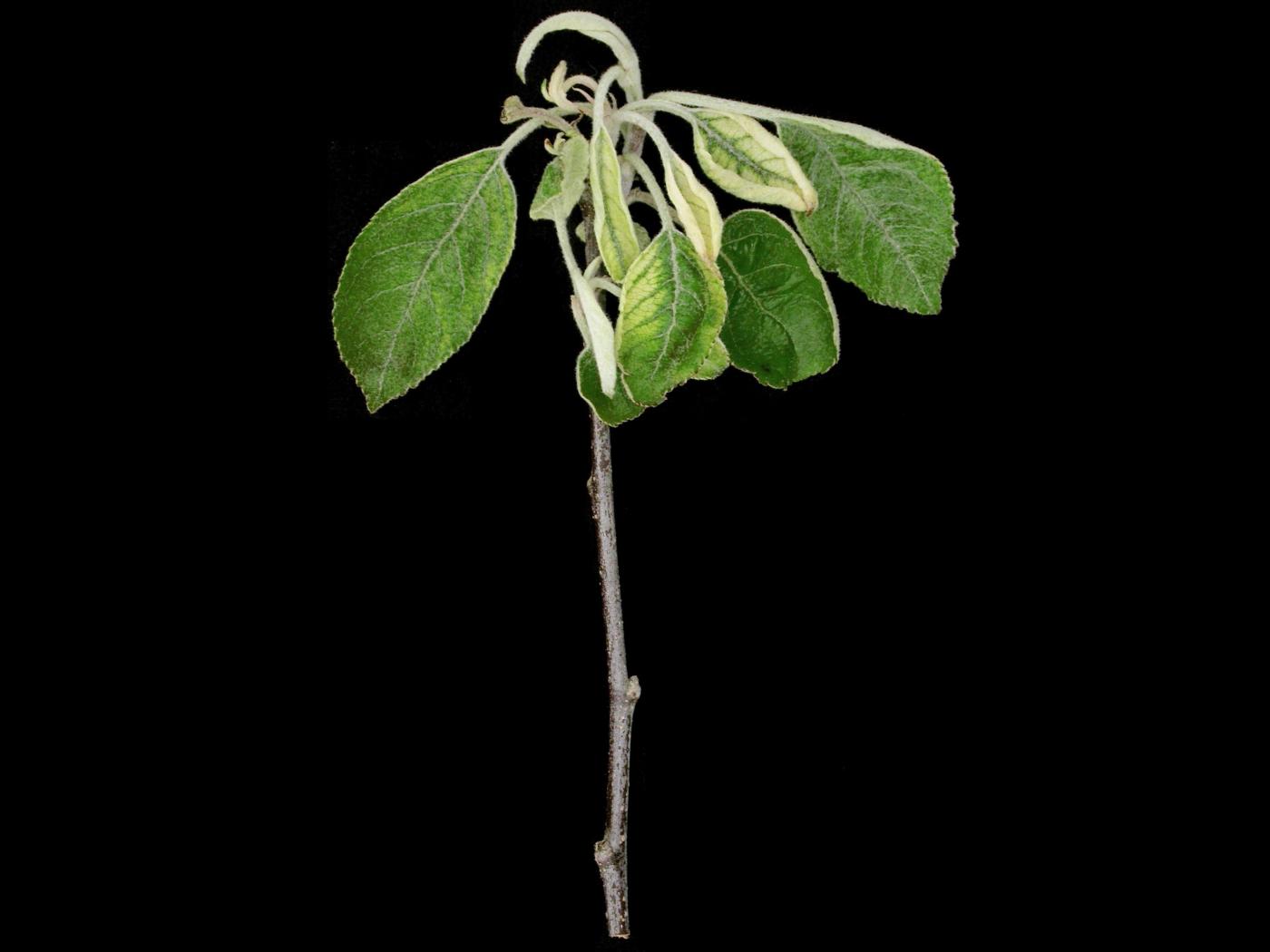 Feuille : les jeunes feuilles et les points de croissance présentent des anomalies de coloration (jaune ou blanc) et des malformations (limbe réduit, feuille effilée ou petite, enroulement). Les nervures demeurent vertes.