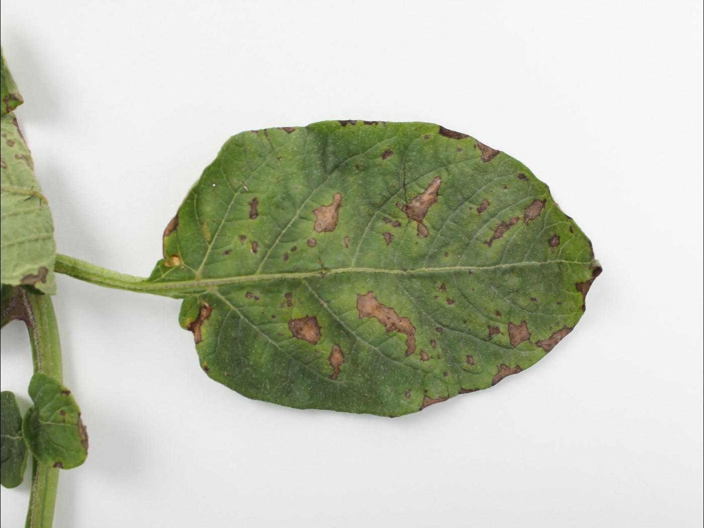 Feuille : présence de taches ou de brûlures brunes et circulaires des tissus touchés seulement. La perte de chlorophylle, pouvant aller jusqu’au blanchiment, et la nécrose des tissus affectés sont caractéristiques.