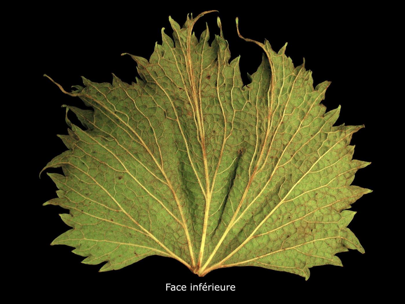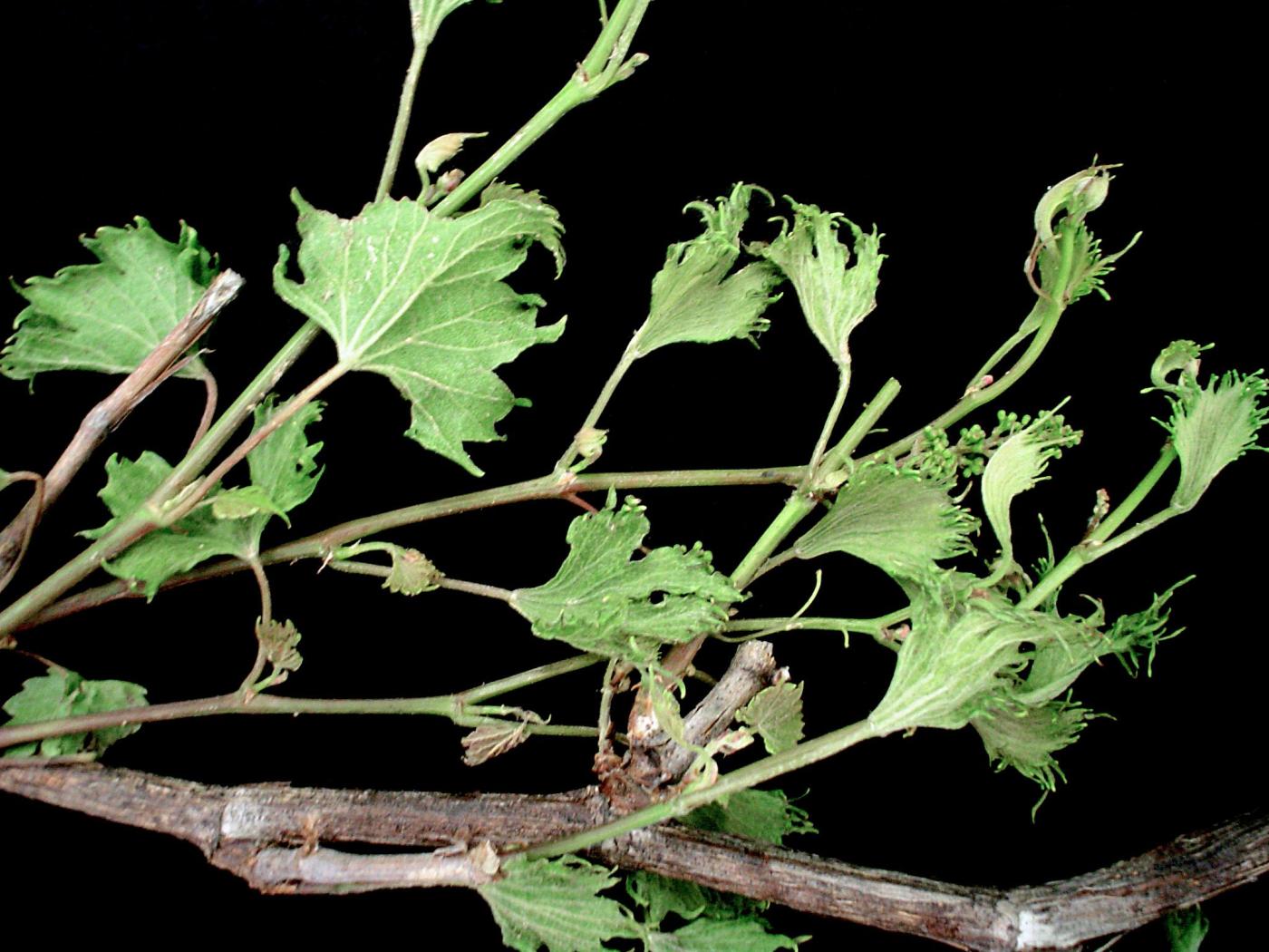 Description: Deux feuilles de vigne présentent des malformations, lorsque comparées à une feuille saine. Sur la feuille de gauche, les symptômes sont modérés et sur celle du centre ils sont sévères. Le limbe présente une malformation caractérisée par une forme asymétrique. À gauche, les lobes ont la forme de dents puisque leurs extrémités sont plus allongées et aiguës. Au centre, le limbe est considérablement réduit, en forme d'éventail, sa marge se prolonge en longues excroissances filiformes. Les nervures … En savoir plus