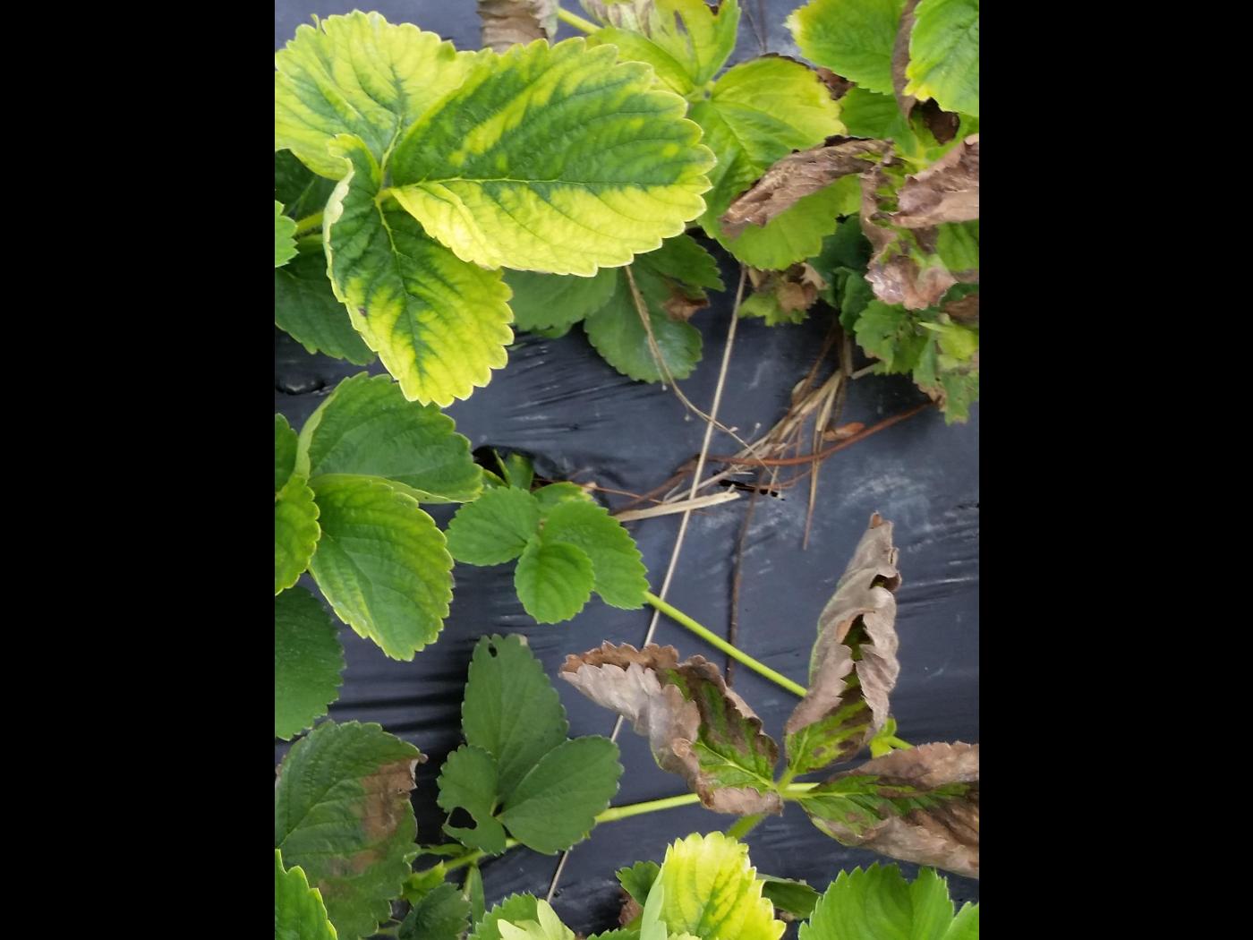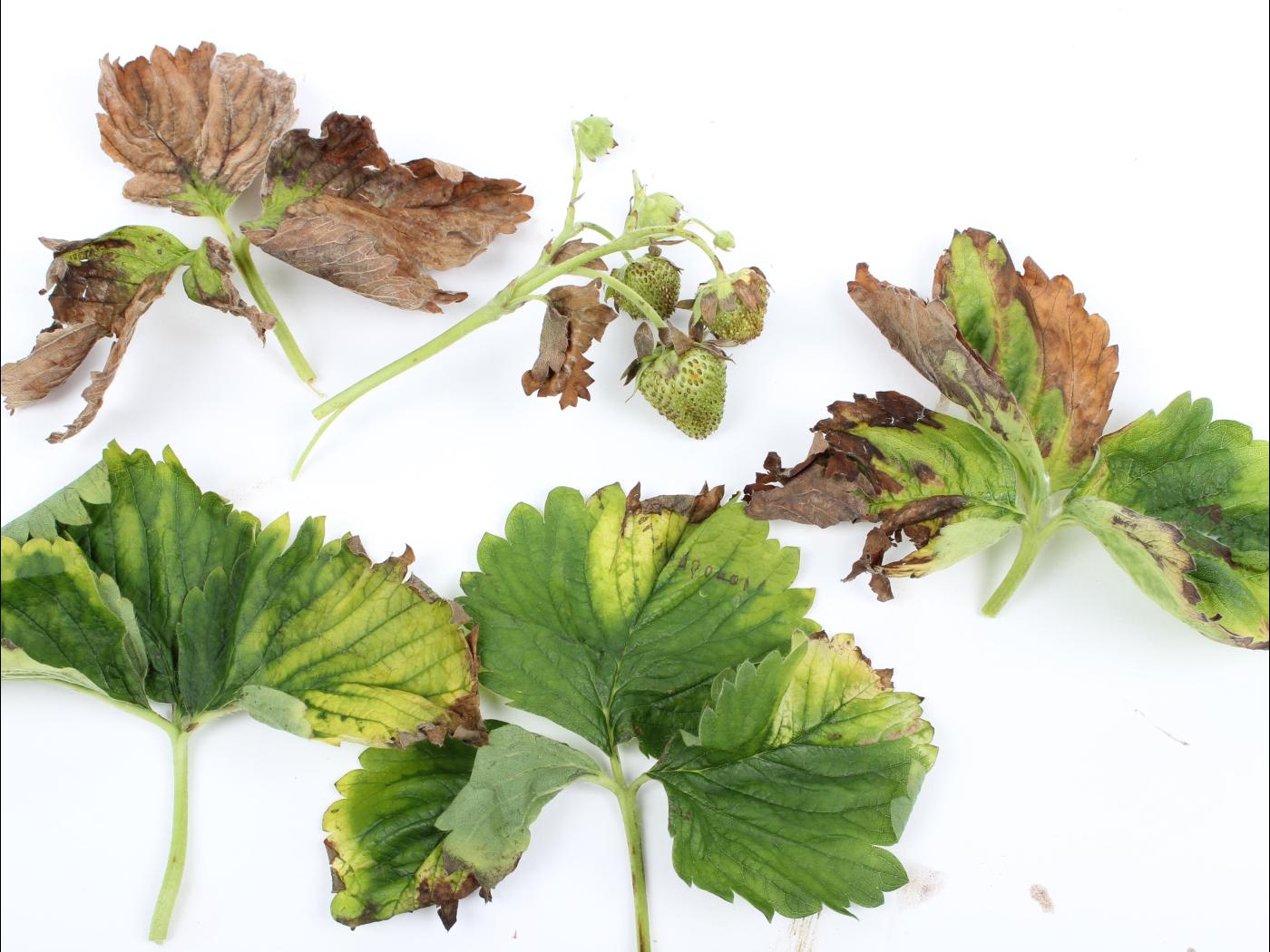 Légende: Feuilles de fraisiers avec brûlures et blanchiment