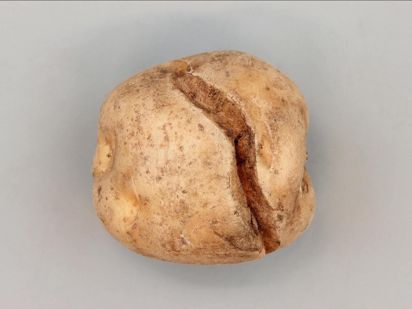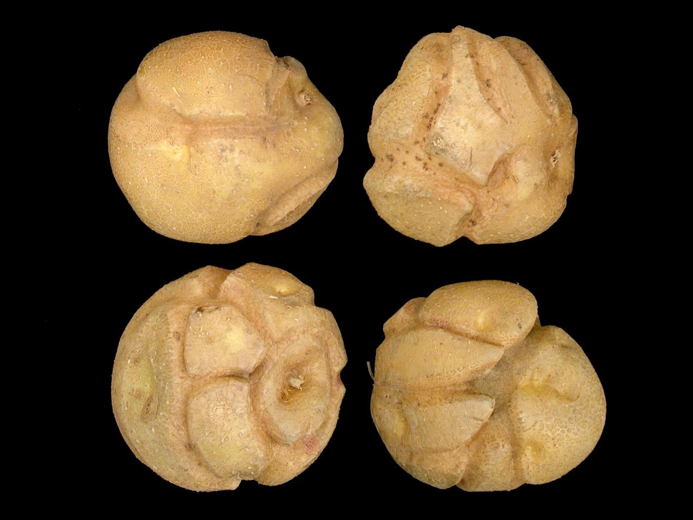 Tubercule : fentes ou crevasses longitudinales, superficielles ou profondes, avec une pelure plus épaisse et rude. Les tubercules présentent différentes formes de malformation, par exemple, une épiderme avec peau d’éléphant ou d’alligator. Lorsqu’une forte dose a été appliquée, les tubercules sont en forme de popcorn ou en chaîne le long du stolon.