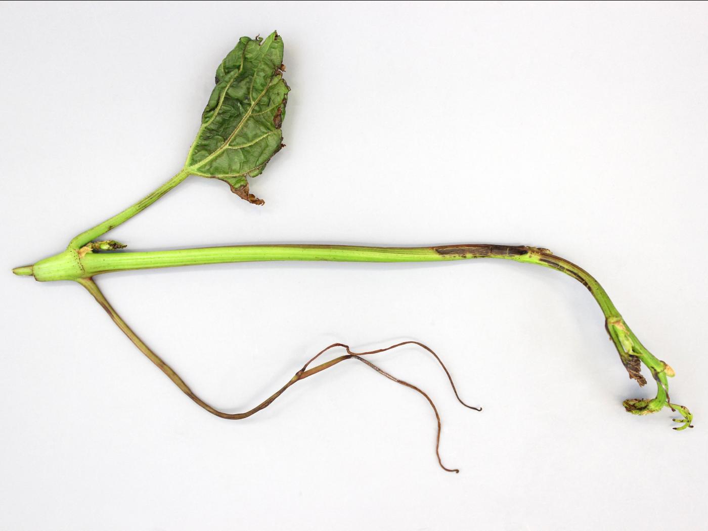 Tige : fragile, cassante et courte. Épinastie et entrenœuds courts. La partie terminale est affectée en premier. Prolifération de tiges donnant un aspect de « balai de sorcière » ou de "zipper".