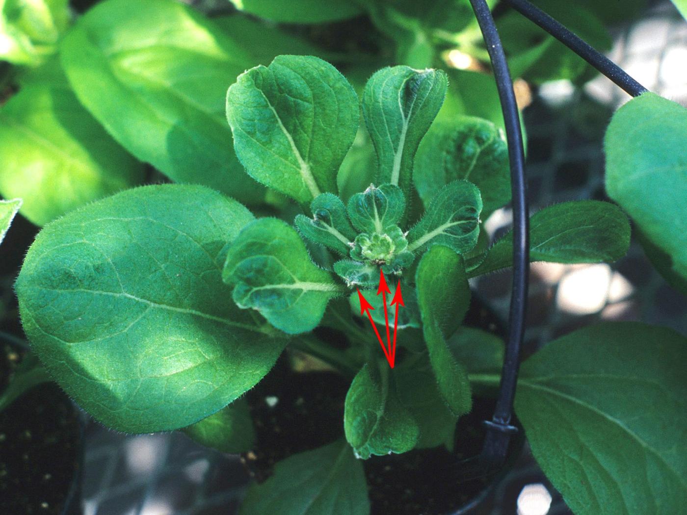 Feuille : présence d’une brûlure de l’apex ou de la marge des jeunes feuilles encore enroulées. Avec l’expansion foliaire, des malformations et du gaufrage apparaissent sur les feuilles affectées. Les feuilles prennent parfois la forme d’un cœur. Mort des points de croissance axillaire. Brunissement potentiel du pétiole.