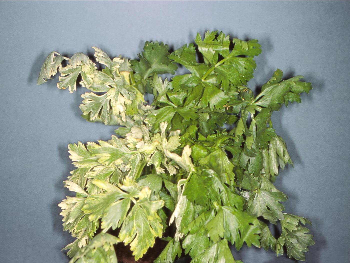Description: Un plant de céleri (cv 'Utha') montre une anomalie de coloration sur les feuilles qui se caractérise par un blanchiment de la marge et une mosaïque blanche. Les feuilles affectées sont toutes situées sur le même côté du plant. Les pétioles présentaient des lignes blanches. Les tests de laboratoire se sont avérés négatifs pour la détection de virus. Les anomalies de coloration s’apparentent à une chimère (désordre génétique).