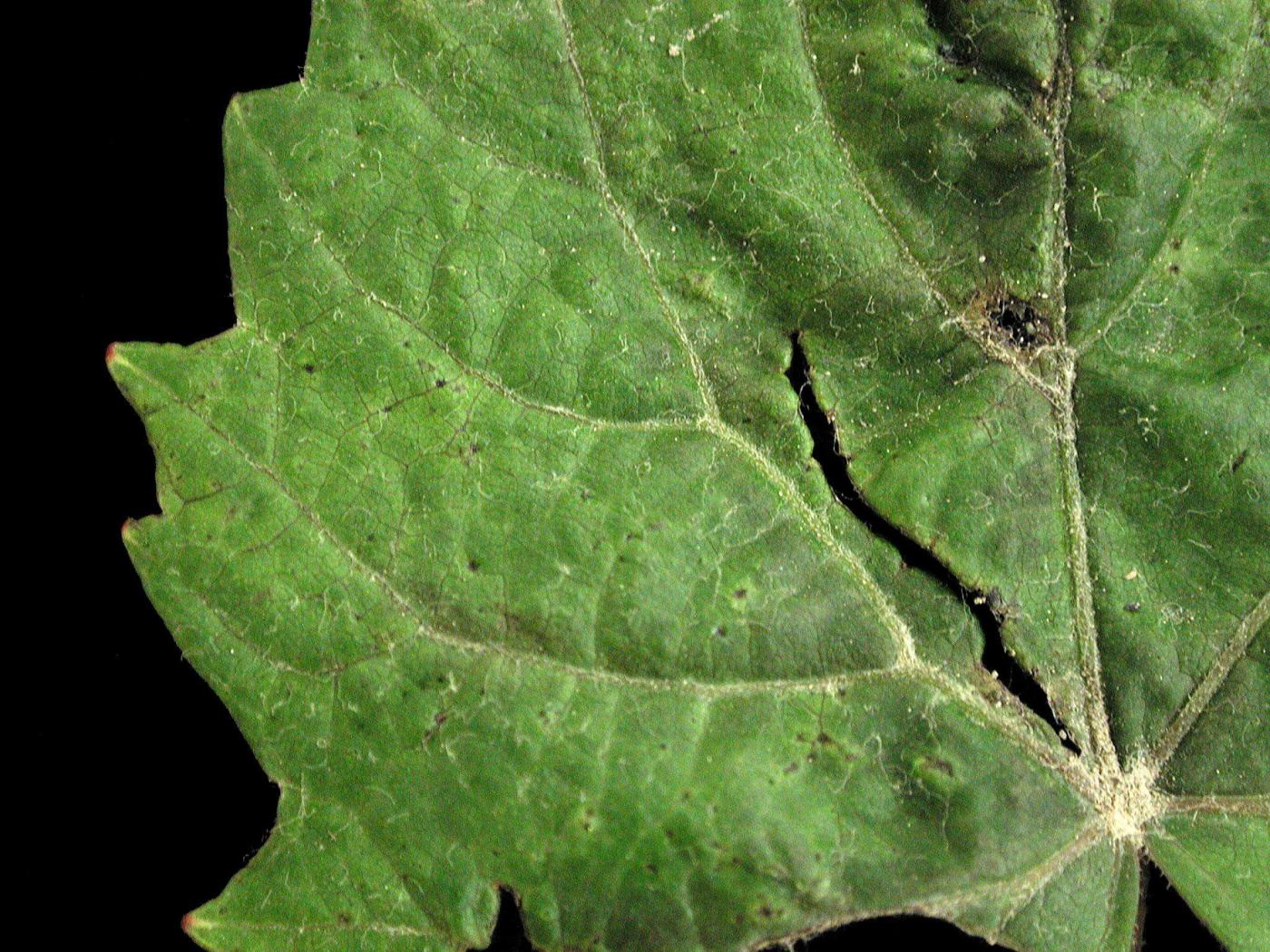 Feuille : présence de taches, ponctuations ou brûlures brunes à noires, souvent à la marge. La démarcation entre les tissus sains et endommagés est souvent très nette. Dessèchement des tissus affectés. Les tissus peuvent être aqueux. Les feuilles peuvent être déformées, recroquevillées ou avec des malformations du limbe et/ou de la marge.