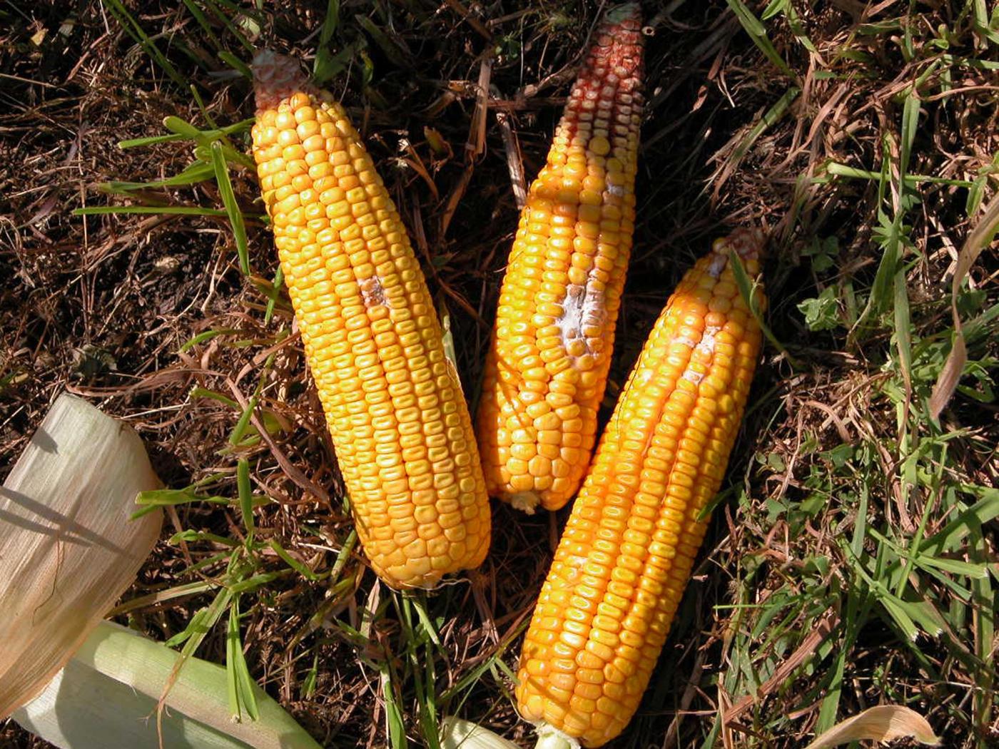 Description: Sur ces épis de maïs grain et fourrager, des grains sont affaissés, pourris ou absents et recouverts d’un mycélium blanc rosé. La grêle est à l’origine des dommages. Les blessures générées aux épis ont facilité l’entrée du champignon pathogène Fusarium sp. Il se manifeste sur les grains par le mycélium blanc rosé observé.