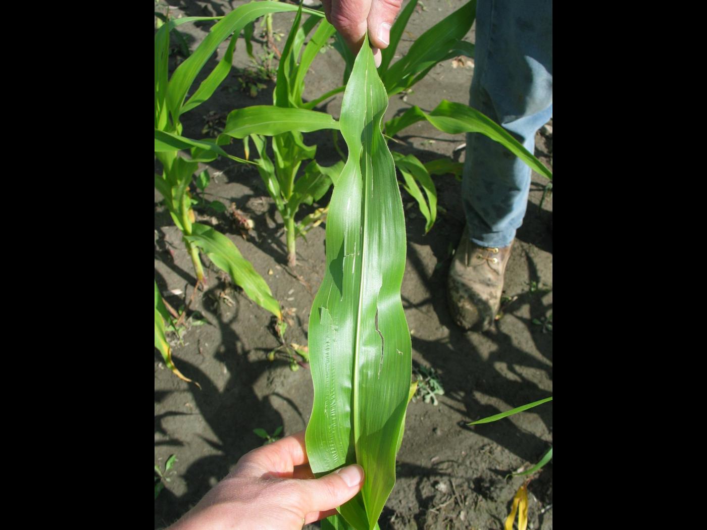 Légende: Lacérations importantes sur feuilles de maïs grain et fourrager
