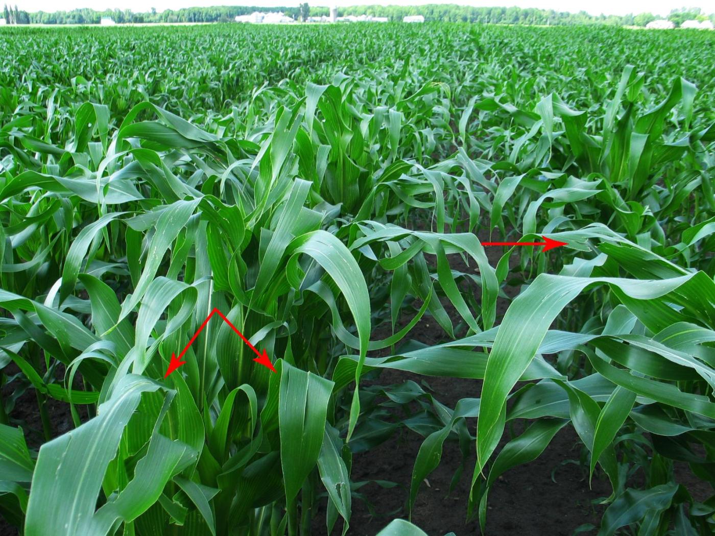 Description: Le limbe de plusieurs feuilles de maïs grain et fourrager s’est déchiré (voir flèches) sous l’impact d’un gros épisode de grêle (juillet 2001). Tous les niveaux de feuilles ont été touchés. Les feuilles lacérées sont réparties aléatoirement dans le champ.