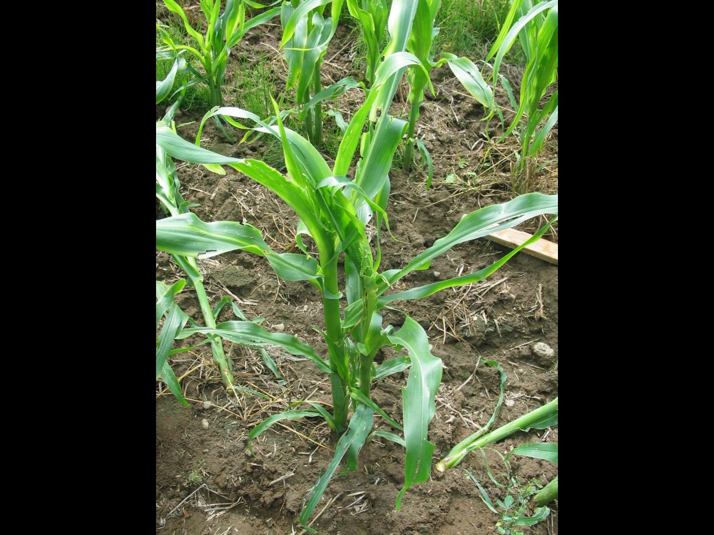 Description: Le limbe de certaines feuilles de maïs grain et fourrager s’est déchiré sous l’impact de la grêle. Tous les niveaux de feuilles ont été touchés puisque les plants sont encore petits, ce qui a permis à la grêle d’atteindre le sol. Sur ce plant, le méristème apical, qui est une zone de division cellulaire active, a été affecté ce qui nuira au développement de la plante.