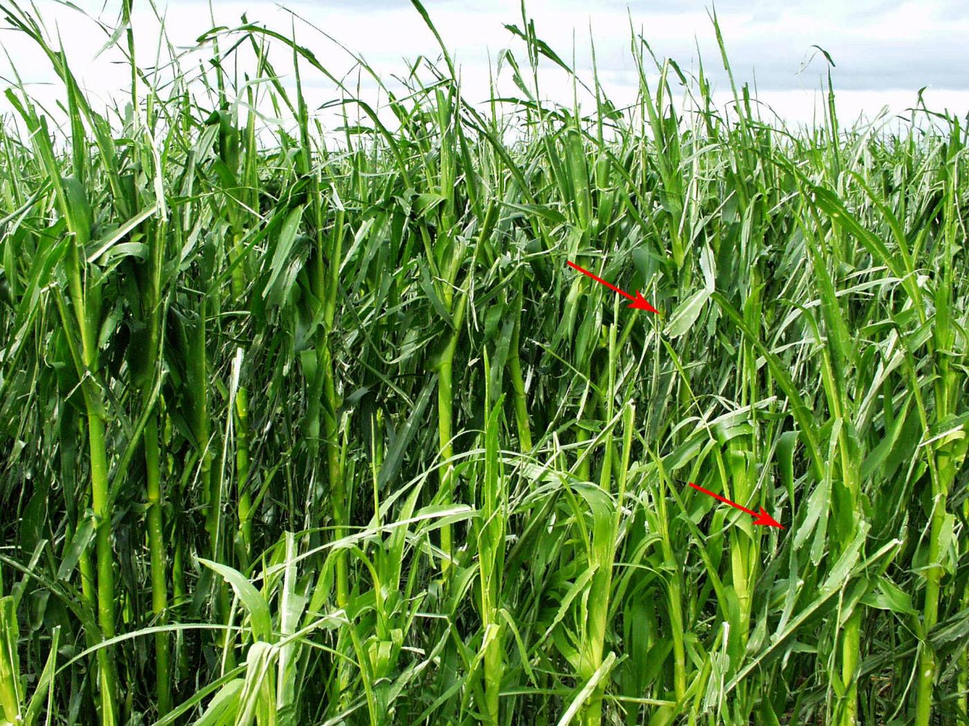 Description: Le limbe de certaines feuilles de maïs grain et fourrager s’est déchiré (voir flèches) sous l’impact de la grêle. Les feuilles médianes et terminales sont les plus touchées. Les feuilles lacérées sont réparties aléatoirement dans le champ.