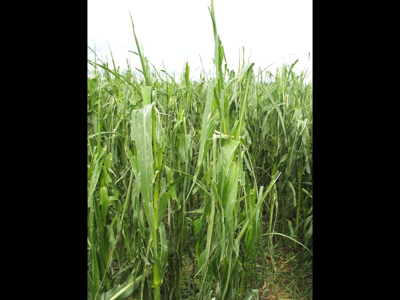 Description: Le limbe de plusieurs feuilles de maïs grain et fourrager s’est déchiré sous l’impact d’un gros épisode de grêle (juillet 2001). Tous les niveaux de feuilles ont été touchés. Les feuilles lacérées sont réparties aléatoirement dans le champ.