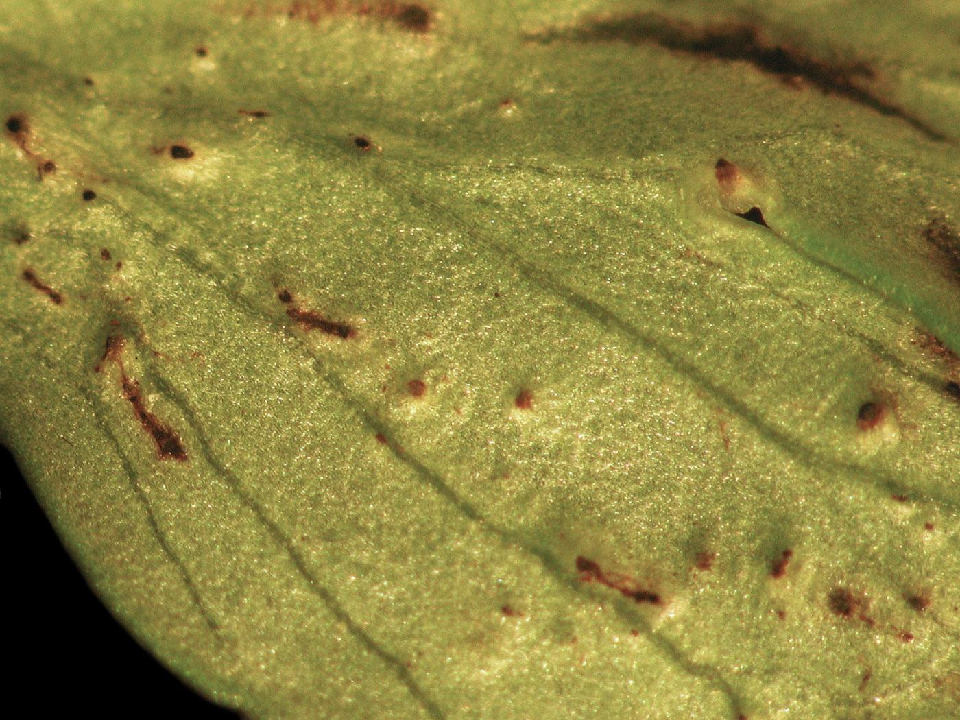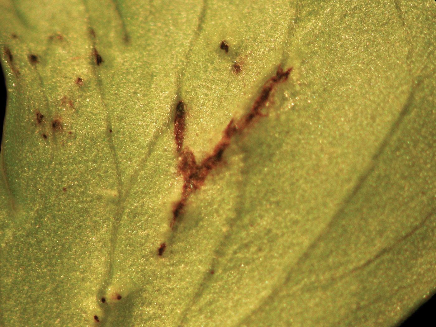 Feuille : présence d’un jaunissement à rougissement de la marge des jeunes feuilles qui progresse entre les nervures. Des brûlures succèdent aux anomalies de coloration. Les feuilles sont petites, déformées et le pétiole est plus épais.