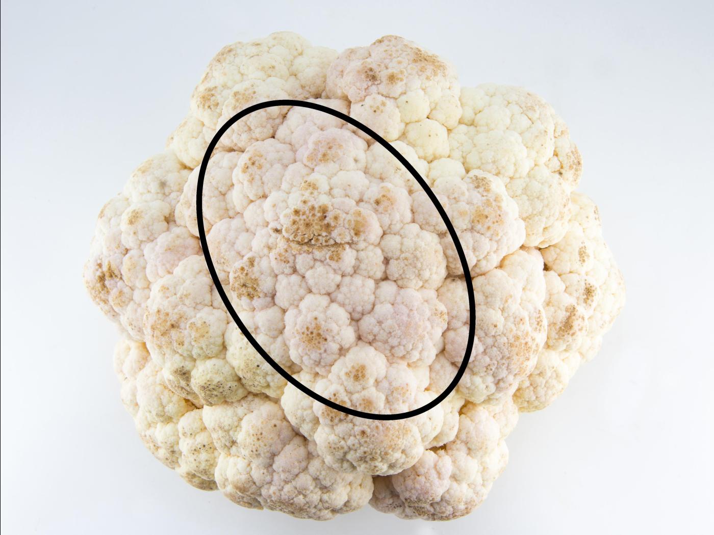 Description: Sur l’inflorescence d’un chou-fleur (cv 'Casper') provenant d’un entrepôt, présence d’une pigmentation rose pâle des fleurons couvrant subtilement le dessus du chou-fleur (voir cercle). Les côtés sont parfois affectés. Ce symptôme est caractéristique du désordre physiologique appelé ''riciness''. La conseillère agricole mentionne qu’à la récolte, la teinte rosée était à peine perceptible et observée sur de petites zones. Ce symptôme s’est accentué lors de l’entreposage et affecte 5 % des choux-f… En savoir plus