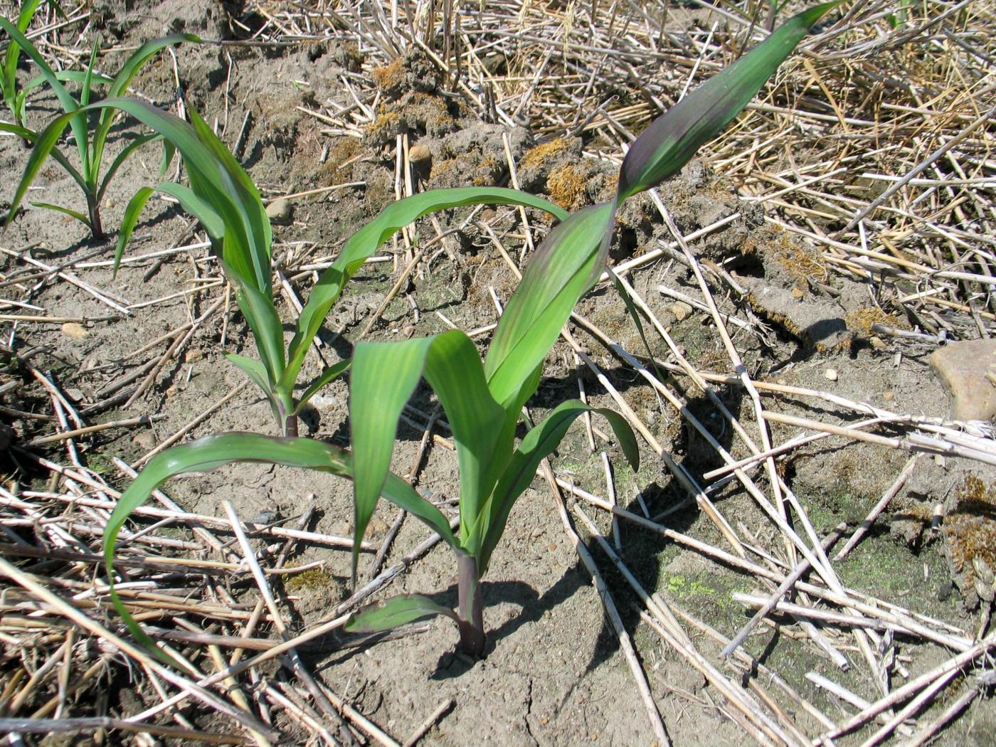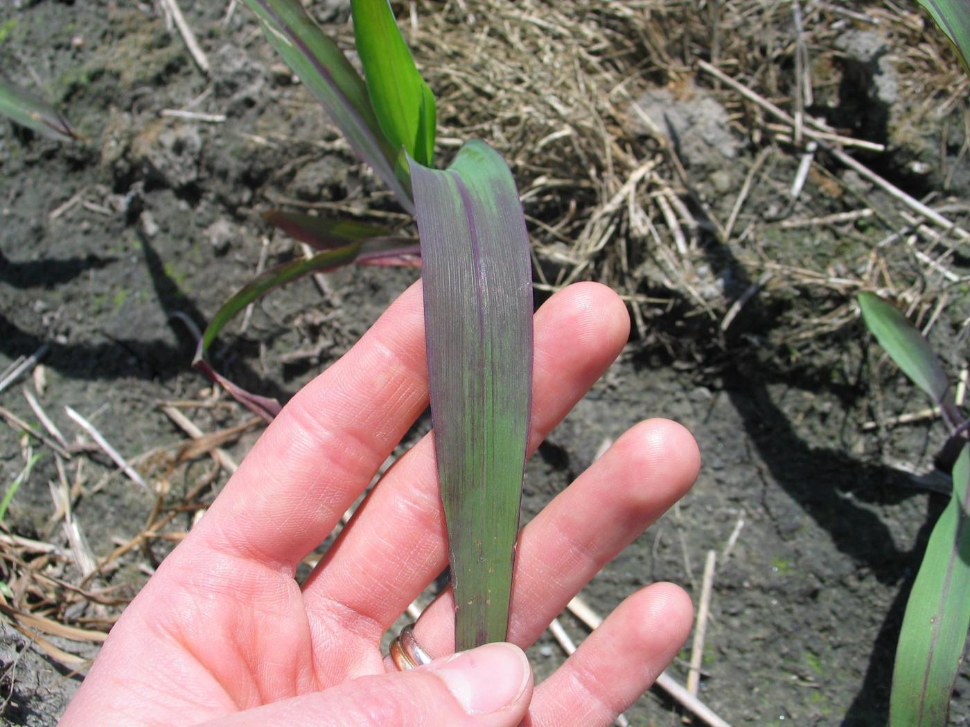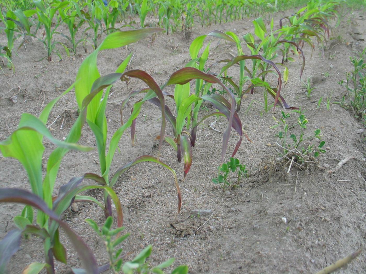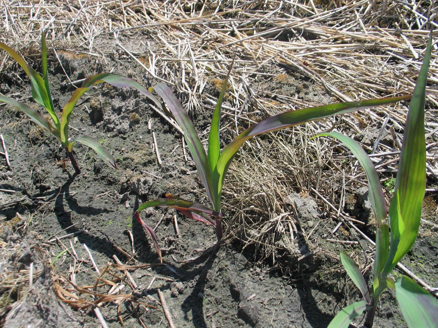 Les dommages causés par le froid peuvent être confondus avec une carence en phosphore. Les plants de maïs qui ont une carence en phosphore sont distribués d’une manière éparse au champ ou ont plus de 6 à 8 feuilles. La carence en phosphore peut être induite lorsqu’elle survient dans des sols froids lorsque les plants sont au stade plantule. Si tous les plants sont mauves, les dommages sont de nature génétique.