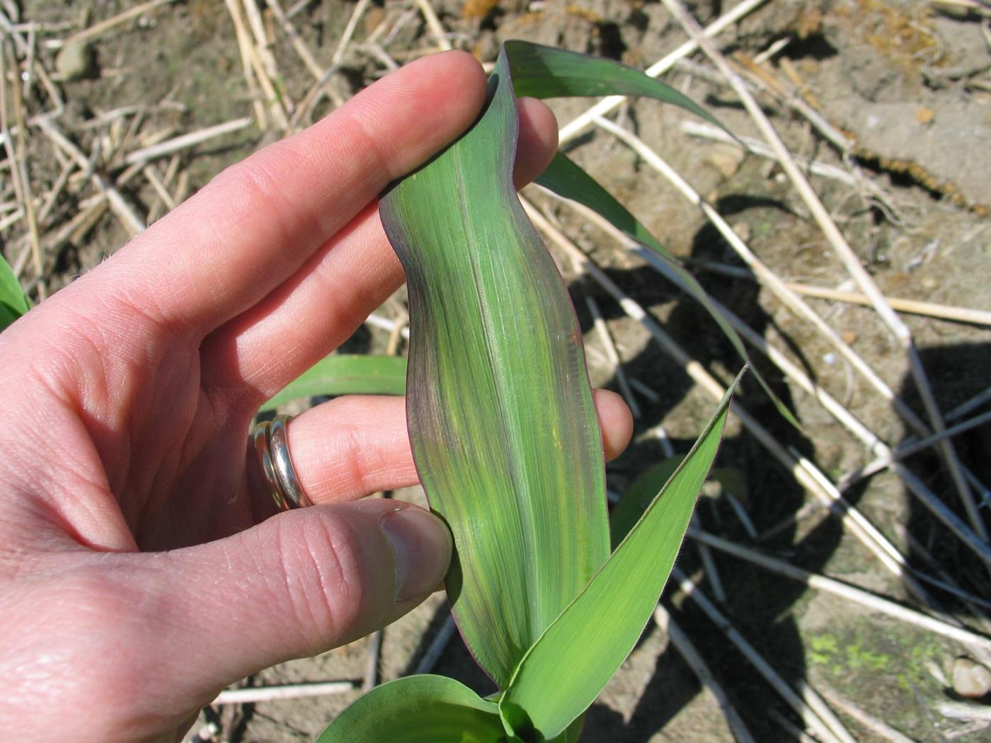 Le froid ralentit la croissance au printemps, mais n’a pas d’incidence sur la croissance par la suite ni sur les rendements, car l’accumulation de l’anthocyane se fait dans la couche supérieure des cellules et n’affecte pas le contenu en chlorophylle de la plante, expliquant pourquoi les feuilles redeviennent vertes par la suite et ont une croissance normale. Les plants affectés sont distribués assez uniformément au champ. Les dommages liés au froid sont occasionnels et mineurs.