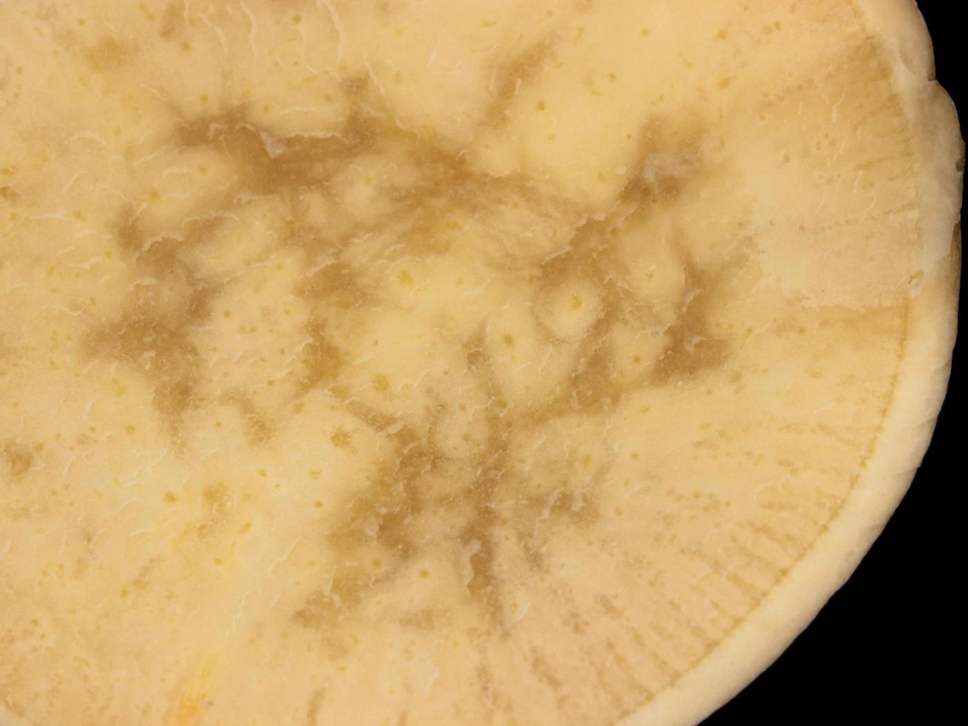 Deux hypothèses peuvent expliquer les symptômes, toutes deux liées à des périodes de chaleur et de sécheresse (manque d'eau). Premièrement, il est possible que les conditions stressantes de chaleur intense et de sécheresse aient conduit à un arrêt de la croissance des plantes. Cela peut avoir conduit les plantes à utiliser leurs réserves d'amidon, ce qui a occasionné le dépérissement et la mort des cellules vidées de cette molécule de réserve. Deuxièmement, il est aussi possible que les symptômes soient liés au fait que les plantes ont absorbé de grandes quantités d'eau à la suite d’une période de sécheresse, ce qui a conduit à l'éclatement des cellules. Dans les deux cas, des symptômes de vitrosité comme ceux présents sur cet échantillon peuvent apparaître. Les symptômes sont généralement distribués d’une manière éparse au champ.