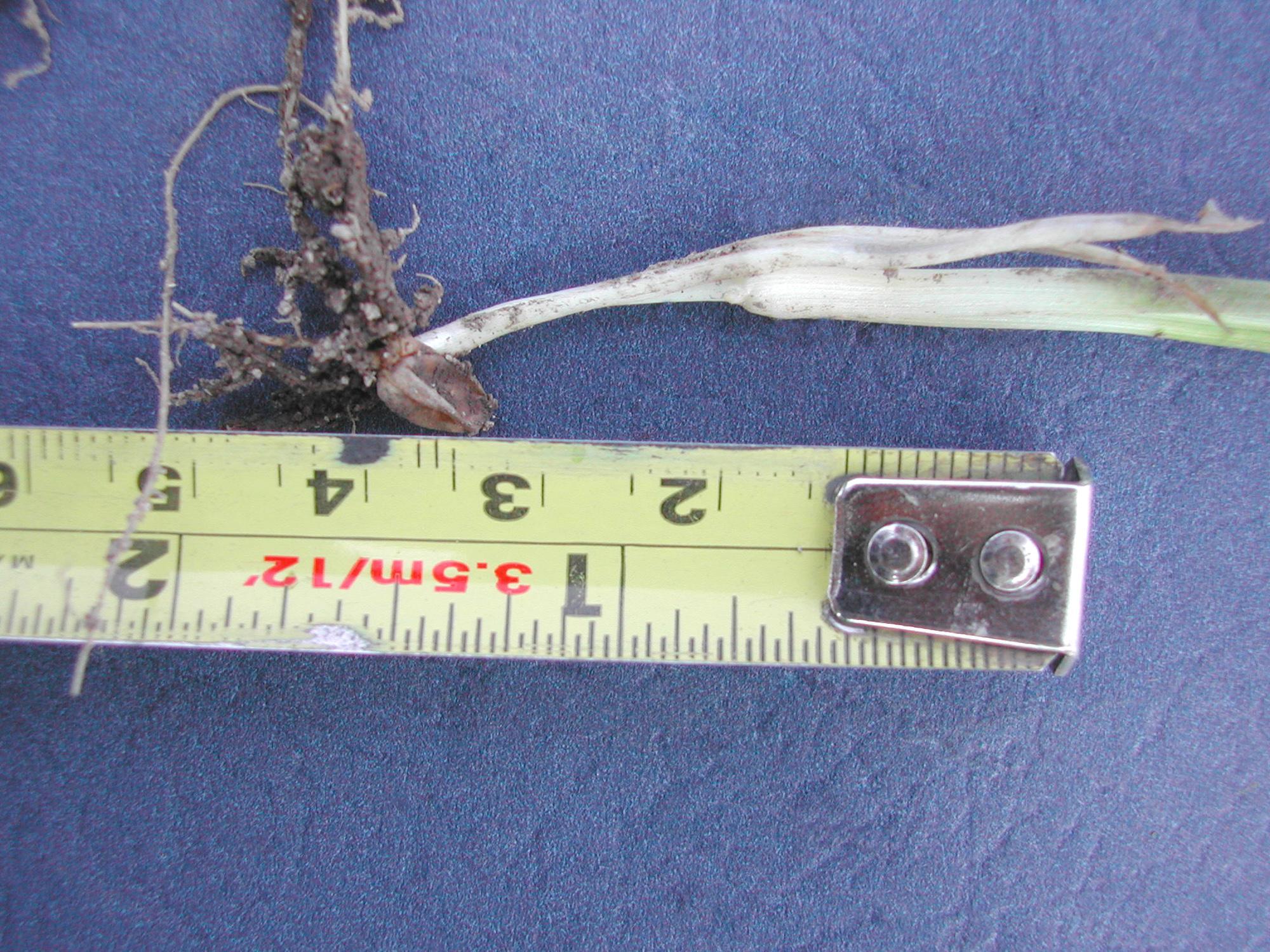 Description: Sur une pousse de blé de printemps, les racines sont faiblement développées et peu ramifiées. Il est impossible de distinguer les racines secondaires (coronales) des racines primaires (séminales). Les racines secondaires devraient se trouver au-dessus des racines séminales alors qu’elles sont absentes ou accolées à la graine. La base de la tige et les premières feuilles sont blanches et chétives. Ces symptômes sont dus à un semis effectué trop profondément (4 cm (1,5 po)).