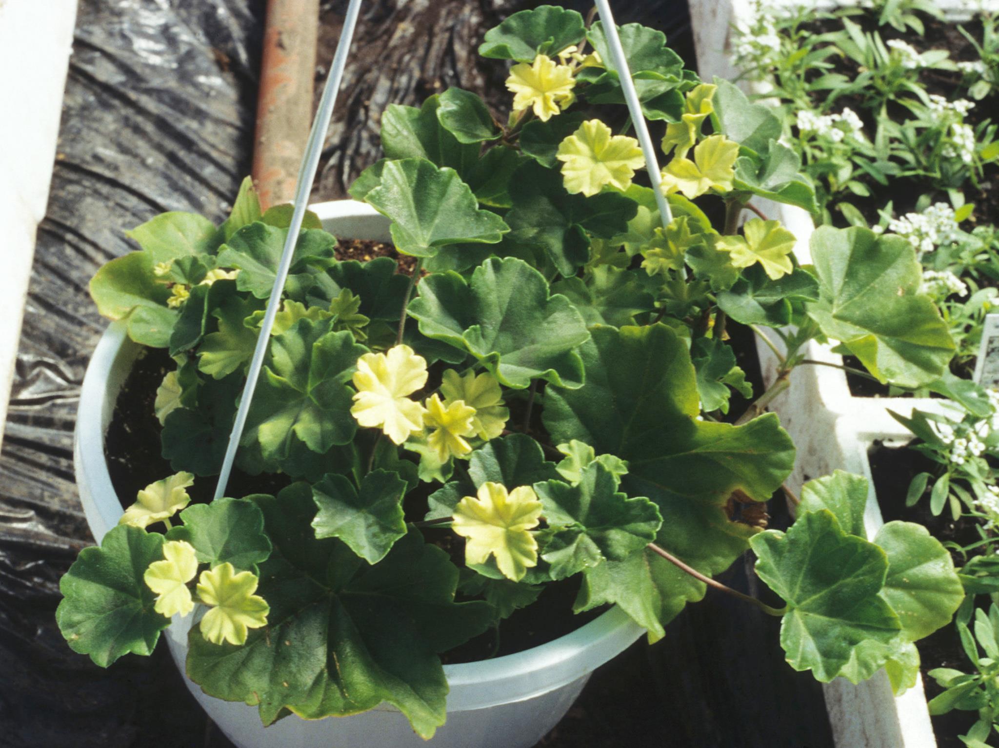 Description: Un géranium lierre montre un jaunissement des jeunes feuilles. Ce plant était placé vis-à-vis la sortie d'air chaud d'une fournaise à air chaud. Seuls les plants situés à proximité de la fournaise présentaient le symptôme (ilot de plants). Le jaunissement des feuilles est une conséquence de la destruction de la chlorophylle due à une température de l’air trop élevée causée par de l’air trop chaud émis par la fournaise. Ce stress de chaleur est différent de celui causé par la température élevée de l’air ambiant de la serre qui cause la mortalité des tissus atteints et vise l’ensemble des plants de la serre.