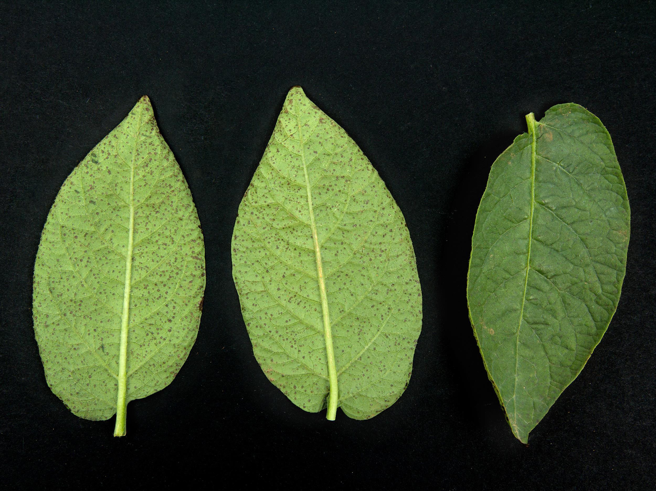Description: À la face inférieure des folioles de pomme de terre (cv 'Mystère'), présence de nombreuses taches noires surélevées, dont les cellules sont éclatées. Ce dommage est caractéristique de l’œdème.