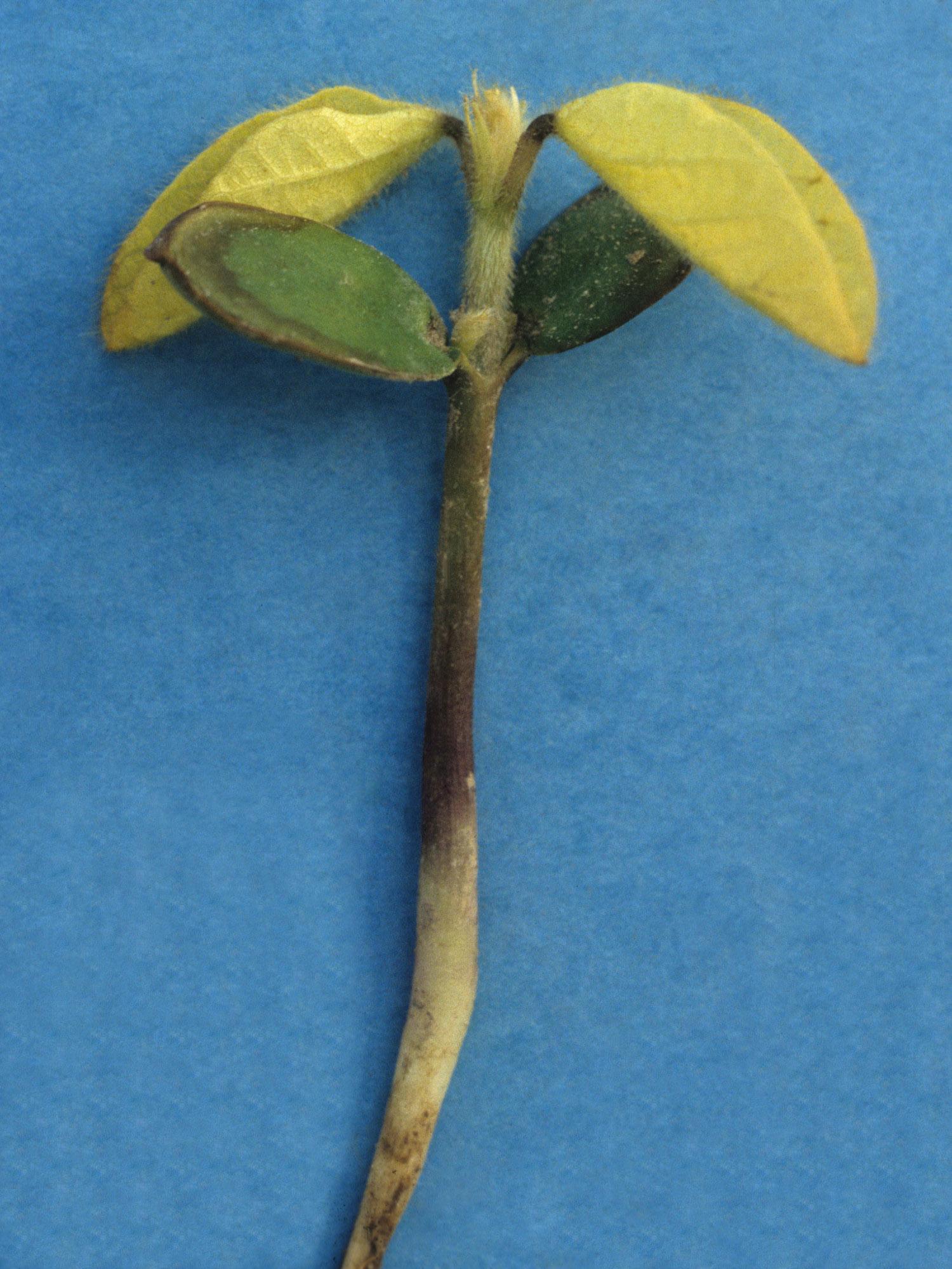 Description: Sur une plantule de soya, les feuilles sont complètement jaunes, les cotylédons ont la marge aqueuse, la tige est pourpre, le collet a des lésions rougeâtres et les racines sont inexistantes. Les tests de laboratoire ont révélé la présence du champignon Rhizoctonia solani, responsable de la fonte des semis.