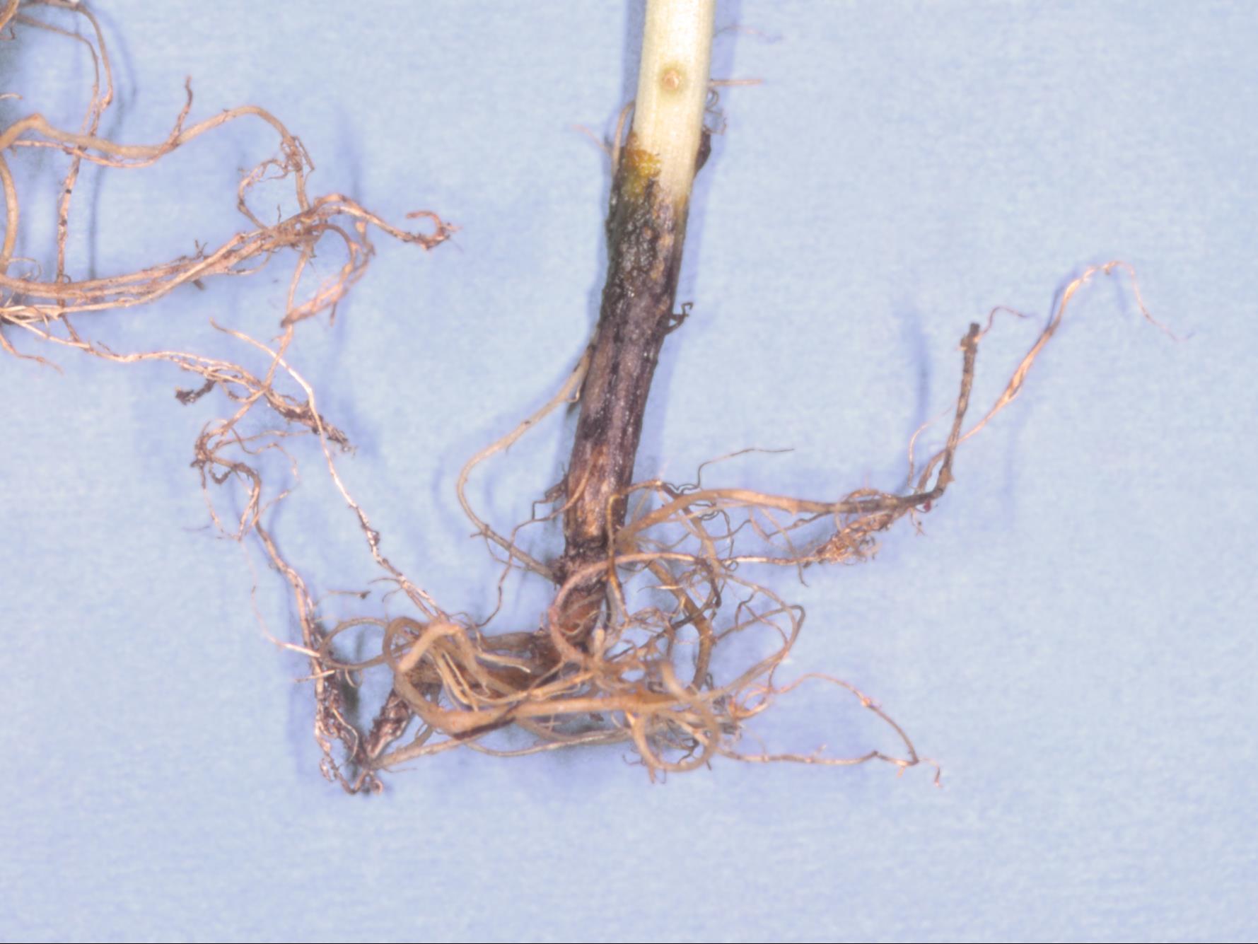 Description: Les plantules de concombre cultivées au champ ont une pourriture noirâtre au collet et au pivot racinaire. Les radicelles sont brun clair et molles. Les feuilles sont jaunes à brunes (non visible ici). Les observations microscopiques ont révélé la présence de conidies du champignon Berkeleyomyces basicola (syn. Thielaviopsis basicola), responsable de la pourriture noire des racines.