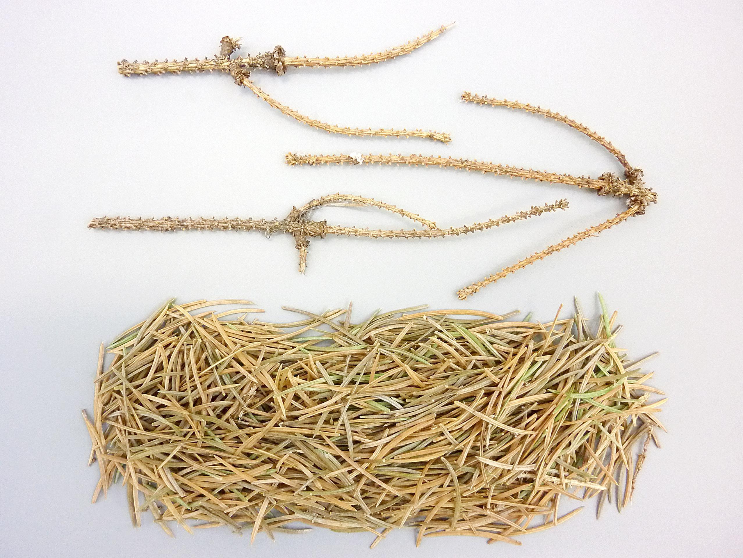Description: Les pousses de l’année d’une épinette de Norvège montrent une brûlure des aiguilles. Certaines aiguilles ont une teinte vert olive à brun tan. Cette anomalie de coloration est observée juste avant le dépérissement des aiguilles. Au toucher, les aiguilles chutent. Sous l'épiderme de la pousse, les tissus sont bruns au niveau des aiguilles les plus affectées (non visible ici). Les tests de laboratoire ont révélé la présence abondante du champignon Phomopsis sp. sous l’épiderme des pousses. Ce champignon est responsable du chancre phomopsien. Des champignons secondaires ont été détectés des aiguilles.