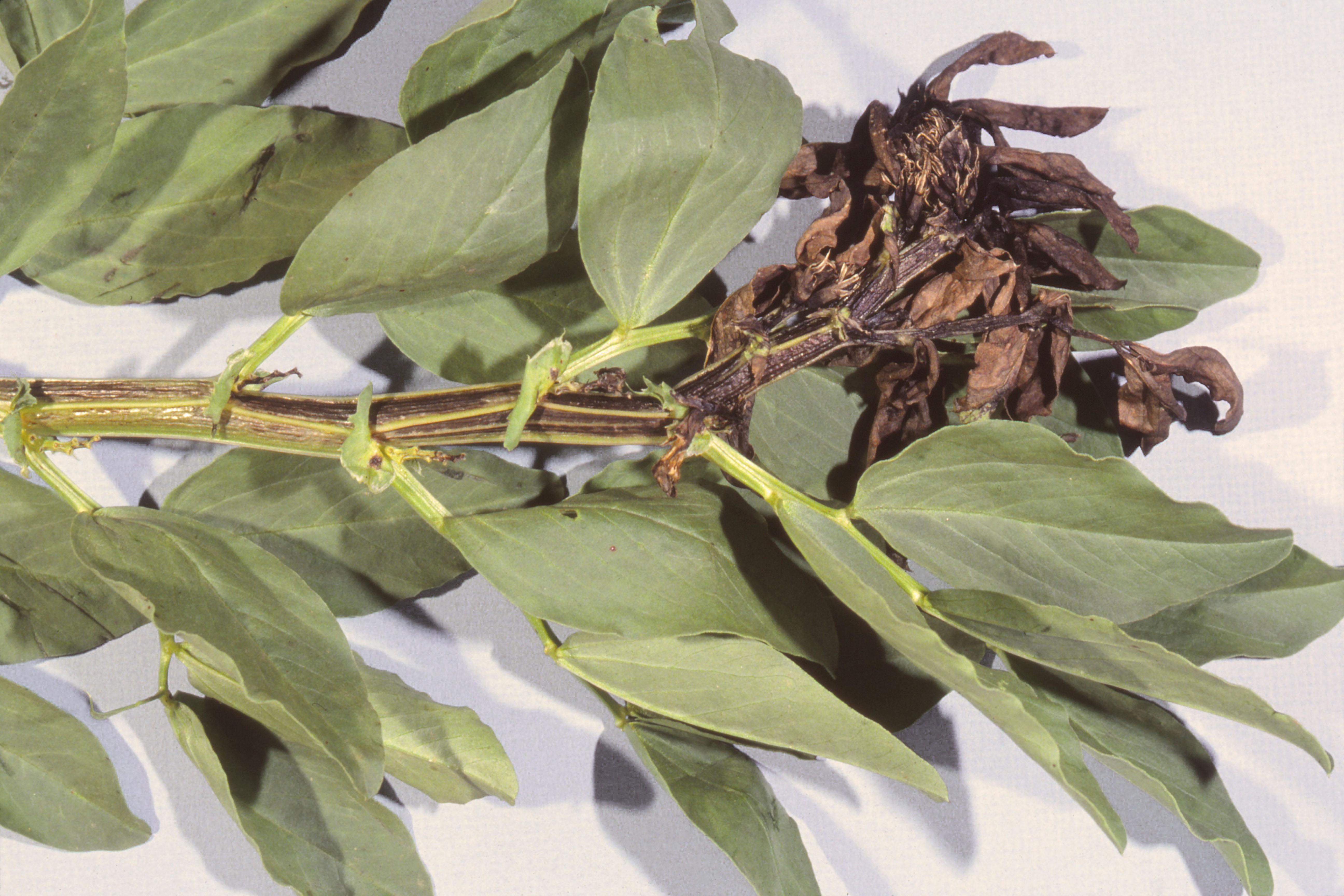 Description: Les jeunes feuilles d’un plant de gourgane montrent une brûlure humide brune à noire. La tête du plant est flétrie. La tige est brune et les vaisseaux sont également affectés (non visible ici). Les tests de laboratoire se sont avérés négatifs pour la détection de bactéries et de champignons. Les symptômes sont causés par une température trop élevée de l’air (chaleur).