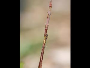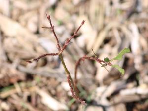 Tige d'un jeune plant de camérisier qui a été complètement défolié. Lorsque tout le feuillage est consommé, les criquets s'attaquent parfois à l'écorce des jeunes tiges.