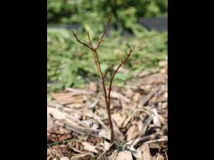 Jeune plant de camérisier complètement défolié à la suite d’une infestation de criquets. La défoliation causée par les criquets peut occasionner une perte de vigueur à court t...
