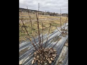 Tiges de camérisier grugées durant l’hiver par des campagnols. Les plants sont à proximité de hautes herbes où le couvert de neige était important, conditions qui favorisent l...