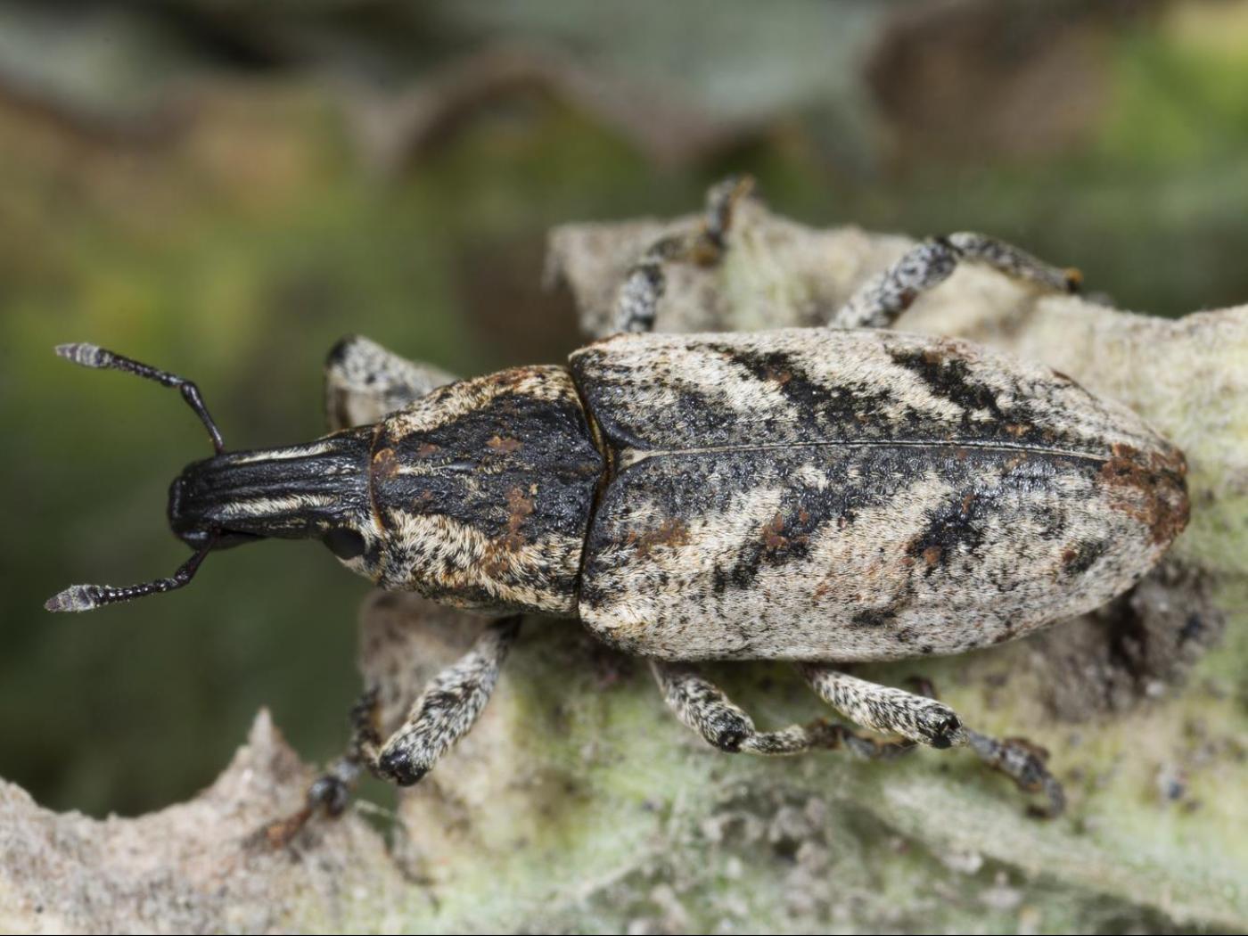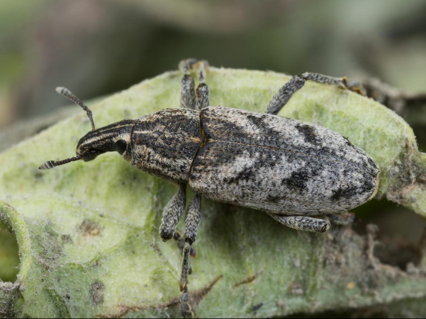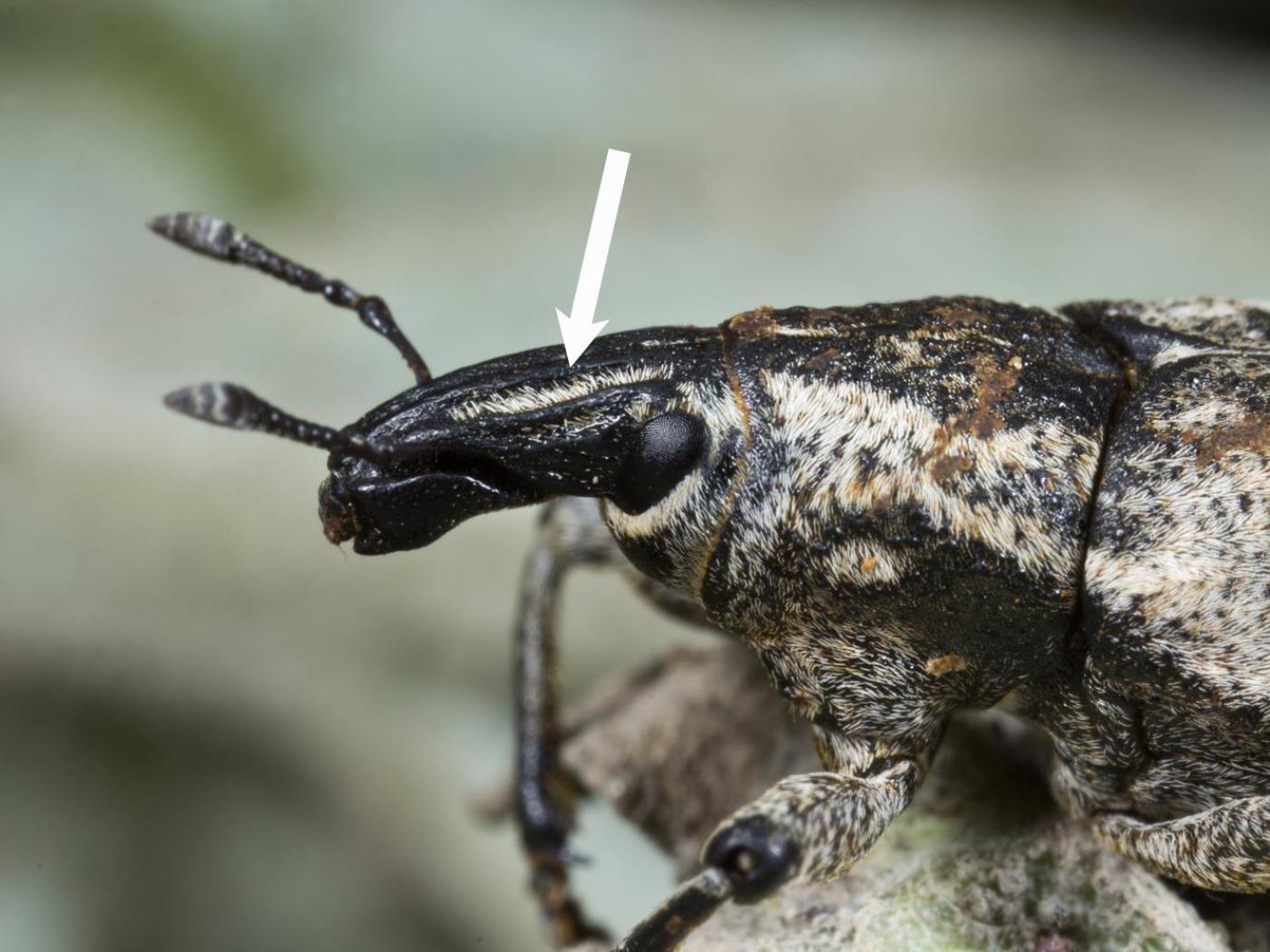 Adulte : 8,0 à 14,0 mm; le corps est noir, mais il est largement recouvert de poils courts et grisâtres; deux motifs en forme de « V » sont présents sur les élytres; le centre du thorax est moins densément parsemé de poils grisâtres; trois larges sillons traversent le rostre sur toute sa longueur.
