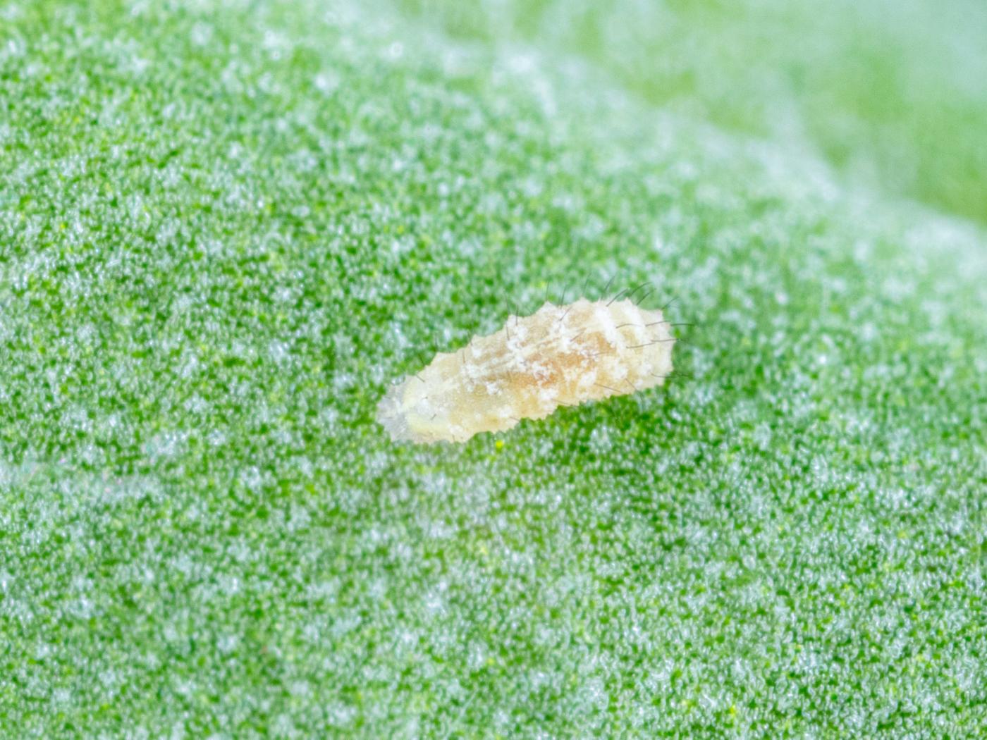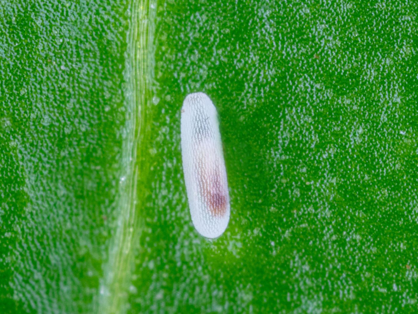Oeuf : 0,9 mm; il possède la forme d’un grain de riz; la coloration est jaune pâle; il est recouvert d’une fine réticulation blanchâtre.